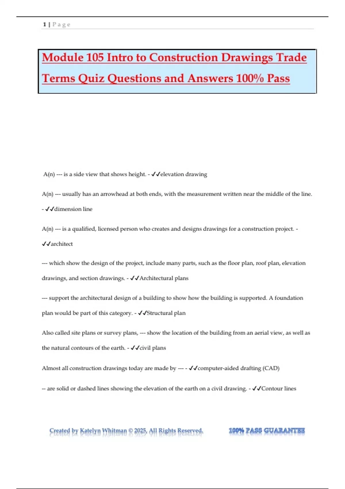 Module 105 Intro to Construction Drawings Trade Terms Quiz Questions and Answers 100% Pass