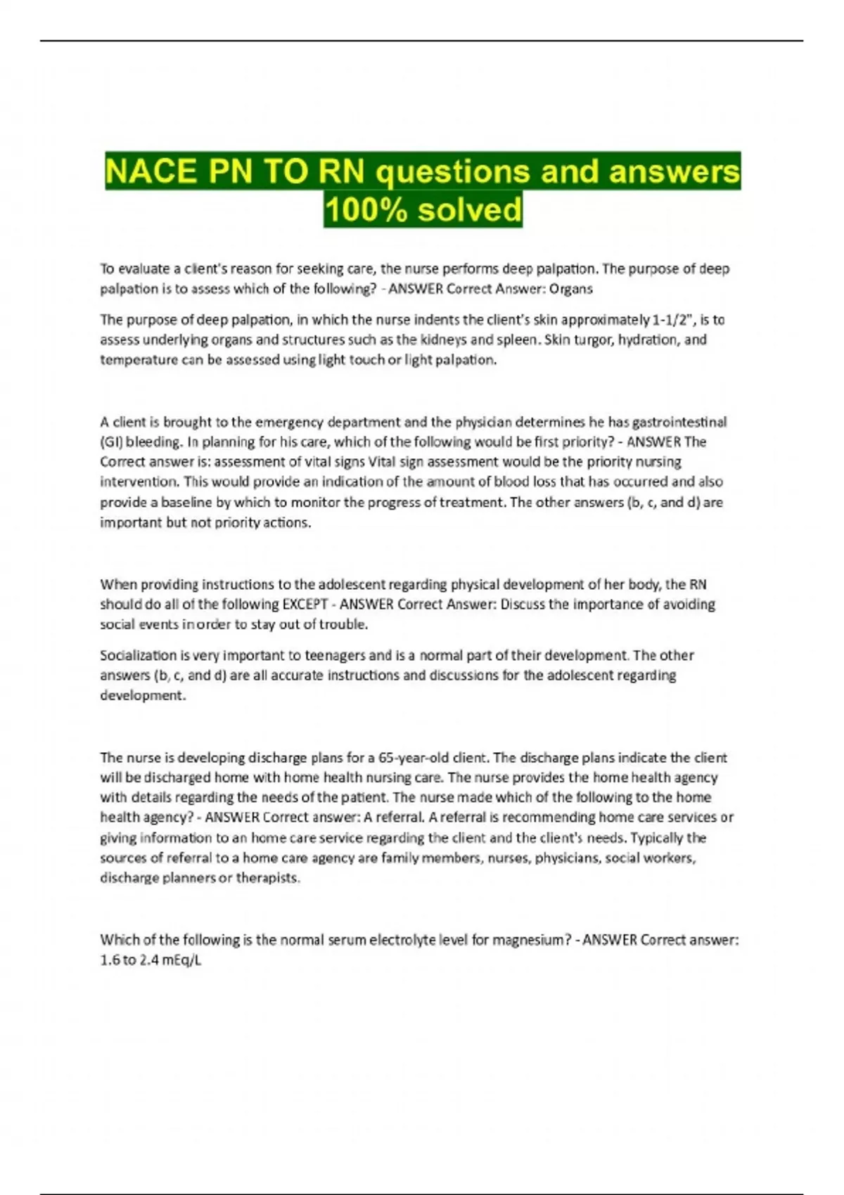 To evaluate a client's reason for seeking care, the nurse performs deep palpation. The purpose of deep palpation is to assess which of the following? - ANSWER Correct Answer: Organs The purpose of deep palpation, in which the nurse indents the client's skin approximately 1-1/2", is to assess underlying organs and structures such as the kidneys and spleen. Skin turgor, hydration, and temperature can be assessed using light touch or light palpation. A client is brought to the emergency department and the physician determines he has gastrointestinal (GI) bleeding. In planning for his care, which of the following would be first priority? - ANSWER The Correct answer is: assessment of vital signs Vital sign assessment would be the priority nursing intervention. This would provide an indication of the amount of blood loss that has occurred and also provide a baseline by which to monitor the progress of treatment. The other answers (b, c, and d) are important but not priority actions. When providing instructions to the adolescent regarding physical development of her body, the RN should do all of the following EXCEPT - ANSWER Correct Answer: Discuss the importance of avoiding social events in order to stay out of trouble. Socialization is very important to teenagers and is a normal part of their development. The other answers (b, c, and d) are all accurate instructions and discussions for the adolescent regarding development. The nurse is developing discharge plans for a 65-year-old client. The discharge plans indicate the client will be discharged home with home health nursing care. The nurse provides the home health agency with details regarding the needs of the patient. The nurse made which of the following to the home health agency? - ANSWER Correct answer: A referral. A referral is recommending home care services or giving information to an home care service regarding the client and the client's needs. Typically the sources of referral to a home care agency are family members, nurses, physicians, social workers, discharge planners or therapists. Which of the following is the normal serum electrolyte level for magnesium? - ANSWER Correct answer: 1.6 to 2.4 mEq/L The school nurse is approached by a mother who explains that her kindergarten child is constantly scratching the perianal area and that the area is irritat