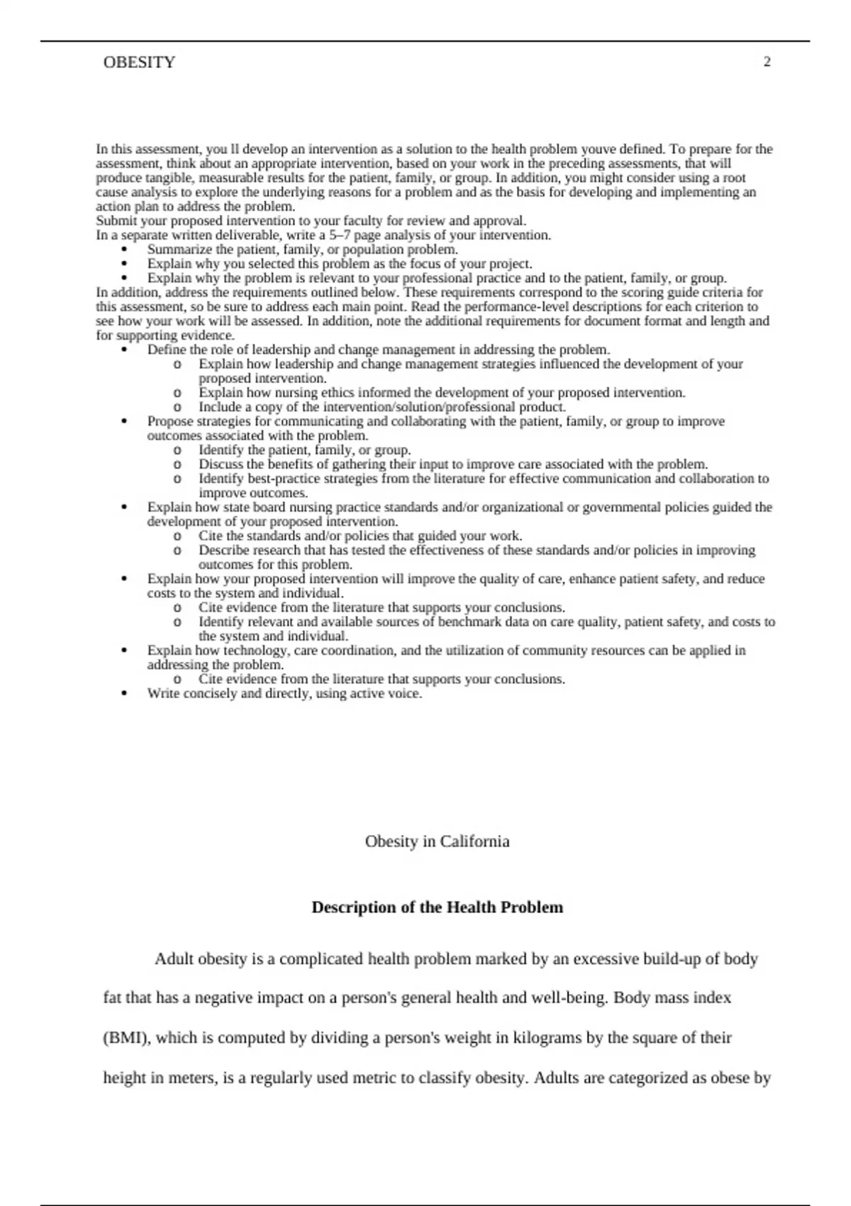 In this assessment, you ll develop an intervention as a solution to the health problem youve defined. To prepare for the assessment, think about an appropriate intervention, based on your work in the preceding assessments, that will produce tangible, measurable results for the patient, family, or group. In addition, you might consider using a root cause analysis to explore the underlying reasons for a problem and as the basis for developing and implementing an action plan to address the problem. Submit your proposed intervention to your faculty for review and approval. In a separate written deliverable, write a 5–7 page analysis of your intervention. • Summarize the patient, family, or population problem. • Explain why you selected this problem as the focus of your project. • Explain why the problem is relevant to your professional practice and to the patient, family, or group. In addition, address the requirements outlined below. These requirements correspond to the scoring guide crite-ria for this assessment, so be sure to address each main point. Read the performance-level descriptions for each criterion to see how your work will be assessed. In addition, note the additional requirements for document for-mat and length and for supporting evidence. • Define the role of leadership and change management in addressing the problem. o Explain how leadership and change management strategies influenced the development of your proposed intervention. o Explain how nursing ethics informed the development of your proposed intervention. o Include a copy of the intervention/solution/professional product. • Propose strategies for communicating and collaborating with the patient, family, or group to improve outcomes associated with the problem. o Identify the patient, family, or group. o Discuss the benefits of gathering their input to improve care associated with the problem. o Identify best-practice strategies from the literature for effective communication and collabora-tion to improve outcomes. • Explain how state board nursing practice standards and/or organizational or governmental policies guided the development of your proposed intervention. o Cite the standards and/or policies that guided your work. o Describe research that has tested the effectiveness of these standards and/or policies in improv-ing outcomes for this problem. • Explain how your proposed intervention will improve the quality of care, enhance patient safety, and reduce costs to the system and individual. o Cite evidence from the literature that supports your conclusions. o Identify relevant and available sources of benchmark data on care quality, patient safety, and costs to the system and individual. • Explain how technology, care coordination, and the utilization of community resources can be applied in addressing the problem. o Cite evidence from the literature that supports your conclusions. • Write concisely and directly, using active voice.
