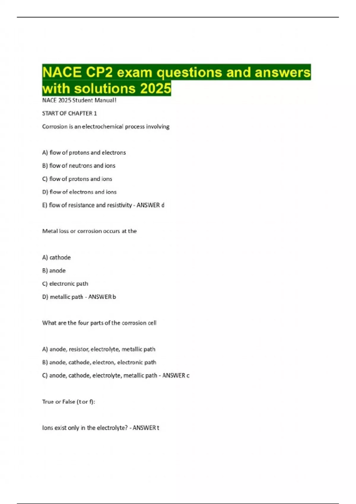 NACE 2025 Student Manual! START OF CHAPTER 1 Corrosion is an electrochemical process involving A) flow of protons and electrons B) flow of neutrons and ions C) flow of protons and ions D) flow of electrons and ions E) flow of resistance and resistivity - ANSWER d Metal loss or corrosion occurs at the A) cathode B) anode C) electronic path D) metallic path - ANSWER b What are the four parts of the corrosion cell A) anode, resistor, electrolyte, metallic path B) anode, cathode, electron, electronic path C) anode, cathode, electrolyte, metallic path - ANSWER c True or False (t or f): Ions exist only in the electrolyte? - ANSWER t Electrons flow in a corrosion cell by which of the following paths? A) anode to cathode via electrolyte B) cathode to anode via electronic path C) anode to cathode via electronic path - ANSWER c At the cathodic surface in a corrosion cell, the electrons from the ____ meet ____ ions from the solution. A) cathode, hydrogen B) cathode, OH- C) anode, hydrogen D) anode, OH- - ANSWER c Oxidation of the metal occurs at the ____ surfaces and reduction of ____ ions occurs at the ____. A) anodic, hydrogen, cathodes B) cathode, OH-, anodic C) anodic, OH-, cathodes D) cathode, anodic, electrolyte E) cathode, hydrogen, electrolyte - ANSWER a True or false Is oxidation necessarily associated with oxygen? - ANSWER f Current flow in a corrosion cell flows which path: A) anode to metallic path to cathode B) anode to electronic path to cathode C) cathode to metallic to anode D) cathode to electrolyte to anode E) anode to electrolyte to cathode