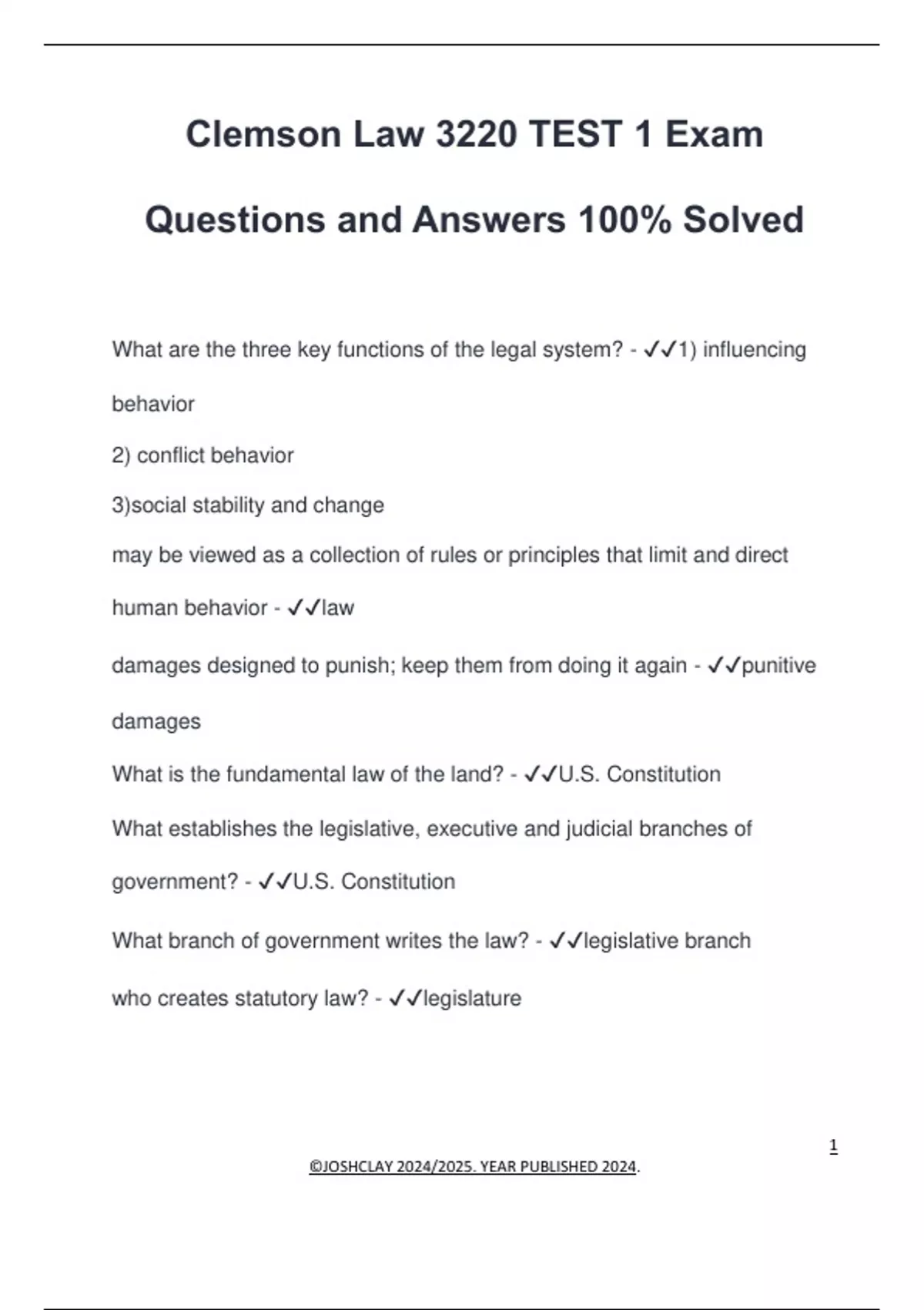 Clemson Law 3220 TEST 1 Exam Questions and Answers 100% Solved What are the three key functions of the legal system? - 1) influencing behavior 2) conflict behavior 3)social stability and change may be viewed as a collection of rules or principles that limit and direct human behavior - law damages designed to punish; keep them from doing it again - punitive damages What is the fundamental law of the land? - U.S. Constitution What establishes the legislative, executive and judicial branches of government? - U.S. Constitution What branch of government writes the law? - legislative branch who creates statutory law? - legislature