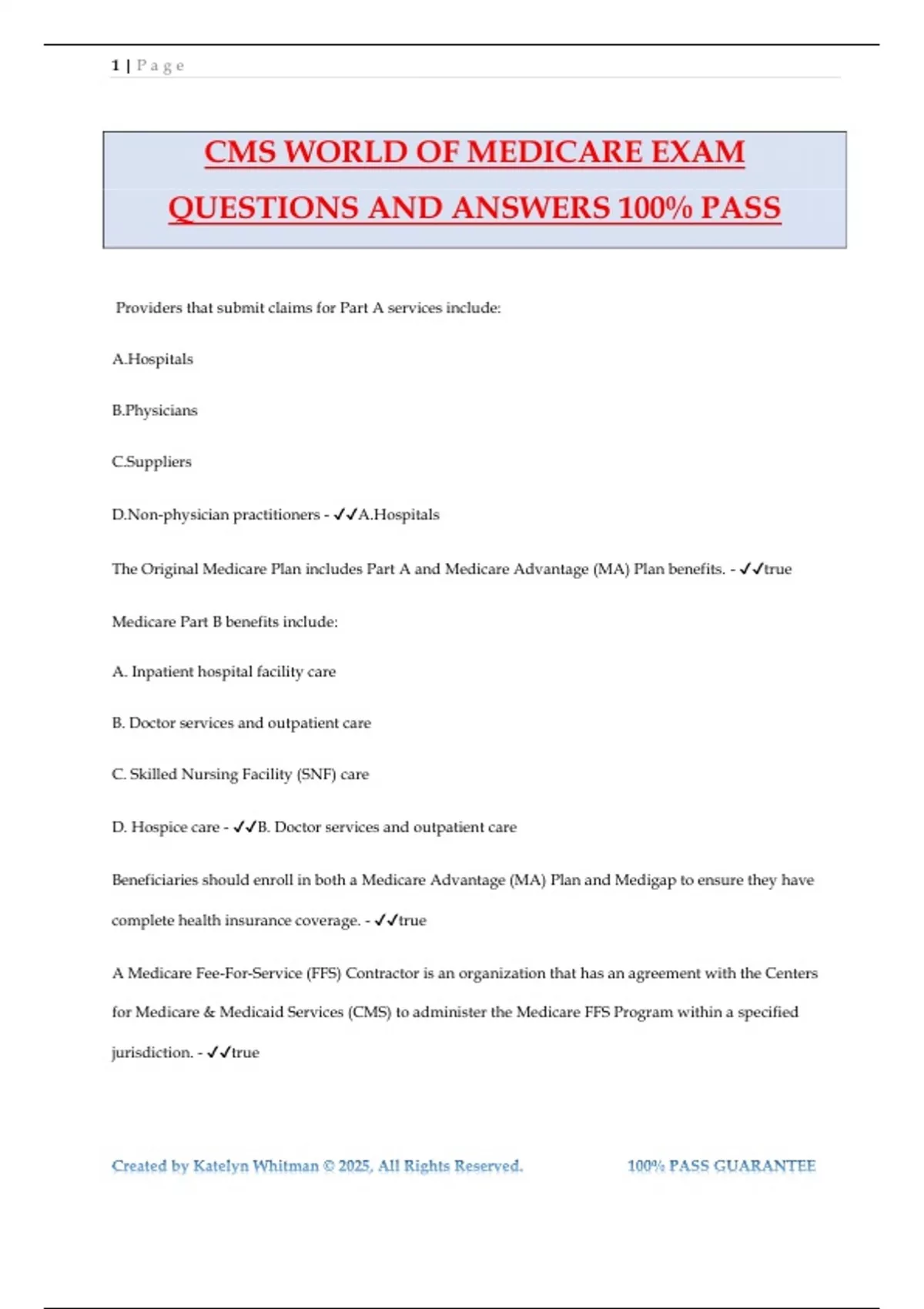 CMS WORLD OF MEDICARE EXAM QUESTIONS AND ANSWERS 100% PASS Providers that submit claims for Part A services include: A.Hospitals B.Physicians C.Suppliers D.Non-physician practitioners - A.Hospitals The Original Medicare Plan includes Part A and Medicare Advantage (MA) Plan benefits. - true Medicare Part B benefits include: A. Inpatient hospital facility care B. Doctor services and outpatient care C. Skilled Nursing Facility (SNF) care D. Hospice care - B. Doctor services and outpatient care Beneficiaries should enroll in both a Medicare Advantage (MA) Plan and Medigap to ensure they have complete health insurance coverage. - true A Medicare Fee-For-Service (FFS) Contractor is an organization that has an agreement with the Centers for Medicare & Medicaid Services (CMS) to administer the Medicare FFS Program within a specified jurisdiction. - true 2 | P a g e Created by Katelyn Whitman © 2025, All Rights Reserved. 100% PASS GUARANTEE Providers and other health care professionals are automatically enrolled in the Medicare Program - false Beneficiaries are enrolled in the Medicare Program through an automatic enrollment process or by applying to the program when they are eligible. - true Each Medicare Prescription Drug Plan has a formulary for beneficiaries enrolling in the plan. - false If a Medicare Advantage (MA) organization declines to include a provider in its network, it must furnish a written notice to the provider of the reason for the decision. - true The Medicare Program serves the aged, certain disabled individuals, and individuals of any age who have been determined to have End-Stage Renal Disease (ESRD). - true The Railroad Retirement Board (RRB) oversees the entire Medicare Program - false Medicare beneficiaries can receive their Medicare benefits, Part A and Part B, through the Original Medicare Plan or through a Medicare Advantage (MA) Pl