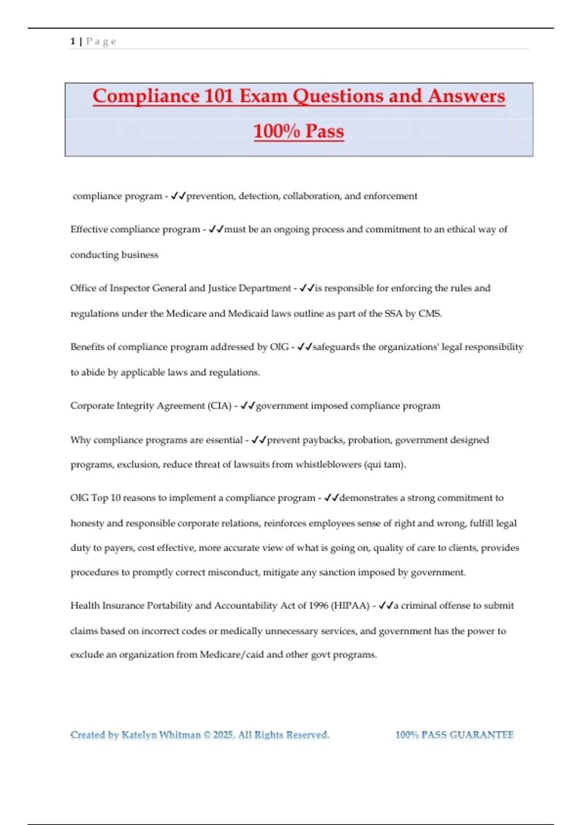 Compliance 101 Exam Questions and Answers 100% Pass compliance program - prevention, detection, collaboration, and enforcement Effective compliance program - must be an ongoing process and commitment to an ethical way of conducting business Office of Inspector General and Justice Department - is responsible for enforcing the rules and regulations under the Medicare and Medicaid laws outline as part of the SSA by CMS. Benefits of compliance program addressed by OIG - safeguards the organizations' legal responsibility to abide by applicable laws and regulations. Corporate Integrity Agreement (CIA) - government imposed compliance program Why compliance programs are essential - prevent paybacks, probation, government designed programs, exclusion, reduce threat of lawsuits from whistleblowers (qui tam). OIG Top 10 reasons to implement a compliance program - demonstrates a strong commitment to honesty and responsible corporate relations, reinforces employees sense of right and wrong, fulfill legal duty to payers, cost effective, more accurate view of what is going on, quality of care to clients, provides procedures to promptly correct misconduct, mitigate any sanction imposed by government. Health Insurance Portability and Accountability Act of 1996 (HIPAA) - a criminal offense to submit claims based on incorrect codes or medically unnecessary services, and government has the power to exclude an organization from Medicare/caid and other govt programs. 2 | P a g e Created by Katelyn Whitman © 2025, All Rights Reserved. 100% PASS GUARANTEE Balanced Budget Act of 1997 - three strikes and your out clause , requiring permanent expulsion if found guilty of fraud a third time. False Claims Act (FCA) - empowers the govt to investigate and bring civil action in fraud cases. Implemented in Civil War to control price gouging. Qui tam - is a whistleblower who brings the fraud to light. A whistleblower can receive a % of the govt's total award - 15-25% if DOJ assumes the case or 25-30% if DOJ declines To avoid lengthy and expensive litigation, an organization can negotiate a ____________with the govt admits no fault or liability but does submit to a govt plan for corrective action. - CIA Length of CIAs - 3-5 yrs with some lasting up to 8 yrs 1984 Congress enacted Sentencing reform act which includes FSG - act designed to correct inequities in federal sentencing and give guidance for assessing fines and methods for calculation of culpability score. The culpability score - calculation of the degree of blame or guilt used to determine fines, restitution, forfeiture, and probation. If an upper level employee has participated in or was willfully ignorant of an offense, - the likelihood of culpability score will be increased. If an organization reports a violation promptly, - the culpability score may be mitigated. An aggravating factor in FSG - is that the organization has had a repeated offense A mitigating factor for FSG - is that the organization cooperated with the govt investigators 3 | P a g e Created by Katelyn Whitman © 2025, All Rights Reserved. 100% PASS GUARANTEE 2010 FSG amendment changes includes way to further reduce culpability scores: - C&E program has responsibility- to report directly to board or appropriate subgroup, to detected offense before external discovery, prompt reporting, no one with OP responsibility participated in, condoned, or was willfully ignorant of the offense. Which of the following is an aggravating factor to a culpability score in the Federal Sentencing Commission released "Chapter 8 Part B - Remedying Harm from Criminal Conduct, and Effective Compliance and Ethics Program?" - If the violation was a repeat offense; The OIG believes every effective compliance Program begins with a formal commitment to seven basic elements, based on and expanding upon the seven steps of the Federal Sentencing Guidelines. Which of the following is not one of the seven elements in the guidance for hospitals? - Terminating employees who have been investigated and found to have committed prior fraudulent acts According to the text, which of the following are "overlooked groups" when it comes to Standards of Conduct/Policies and Procedures? (Choose all that apply) - Suppli