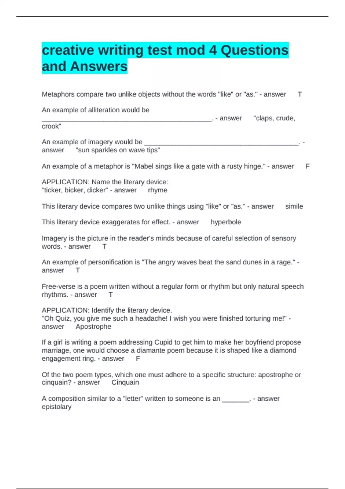 creative writing test mod 4 Questions and Answers Metaphors compare two unlike objects without the words "like" or "as." T An example of alliteration would be ____________________________________________. "claps, crude, crook" An example of imagery would be ________________________________________. "sun sparkles on wave tips" An example of a metaphor is "Mabel sings like a gate with a rusty hinge." F APPLICATION: Name the literary device: "ticker, bicker, dicker" rhyme This literary device compares two unlike things using "like" or "as." simile This literary device exaggerates for effect. hyperbole Imagery is the picture in the reader's minds because of careful selection of sensory words. T An example of personification is "The angry waves beat the sand dunes in a rage." T Free-verse is a poem written without a regular form or rhythm but only natural speech rhythms. T APPLICATION: Identify the literary device. "Oh Quiz, you give me such a headache! I wish you were finished torturing me!" Apostrophe If a girl is writing a poem addressing Cupid to get him to make her boyfriend propose marriage, one would choose a diamante poem because it is shaped like a diamond engagement ring. F Of the two poem types, which one must adhere to a specific structure: apostrophe or cinquain? Cinquain A composition similar to a "letter" written to someone is an _______. epistolary Which of the following words would indicate the tone of a poem? humorous An apostrophe in poetry is the same as it is in punctuation. F Both diamante and cinquain poems are written in free verse. F A(n) ________ poem uses each letter of a word to create each line of a poem. acrostic APPLICATION: Identify the word in BOLD, UNDERLINED FONT. "Mom burned my toast!" PARTICIPLE or VERB? verb Acrostic poems are written as anagrams. F APPLICATION: Name the part of the stage. Which of the following is in the center from left to right and front to back? center Plays must have _________. dramatic questions Sluglines offer instructions and the setting for the scene. T Plays are different from fiction in that plays do not _________. reveal inner struggles through the character's thoughts Sound effects are written in the scene directions. F Which era used drama to instruct the Bible to the illiterate lower classes? Medieval England Indicating that a character "groans desperately" would be written in the stage directions. F Which sound effect would be ineffective in establishing the kitchen as a setting? birds singing outside the window Prewriting for a play includes everything except ___________. writing the theme Characters in a play must ___________. All of the answers Knowledge of the stage and its surrounding parts is fundamental to the action and the clear visibility of that action. T The Greeks were the ones who formalized dramatic plays, writing stories of the ancient myths and heroes. T