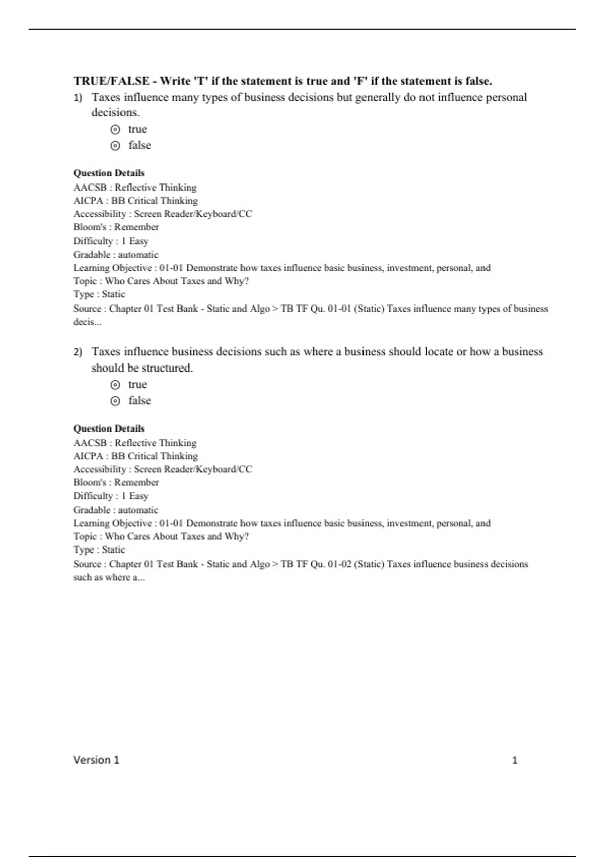 Source : Chapter 01 Test Bank - Static and Algo > TB TF Qu. 01-01 (Static) Taxes influence many types of business