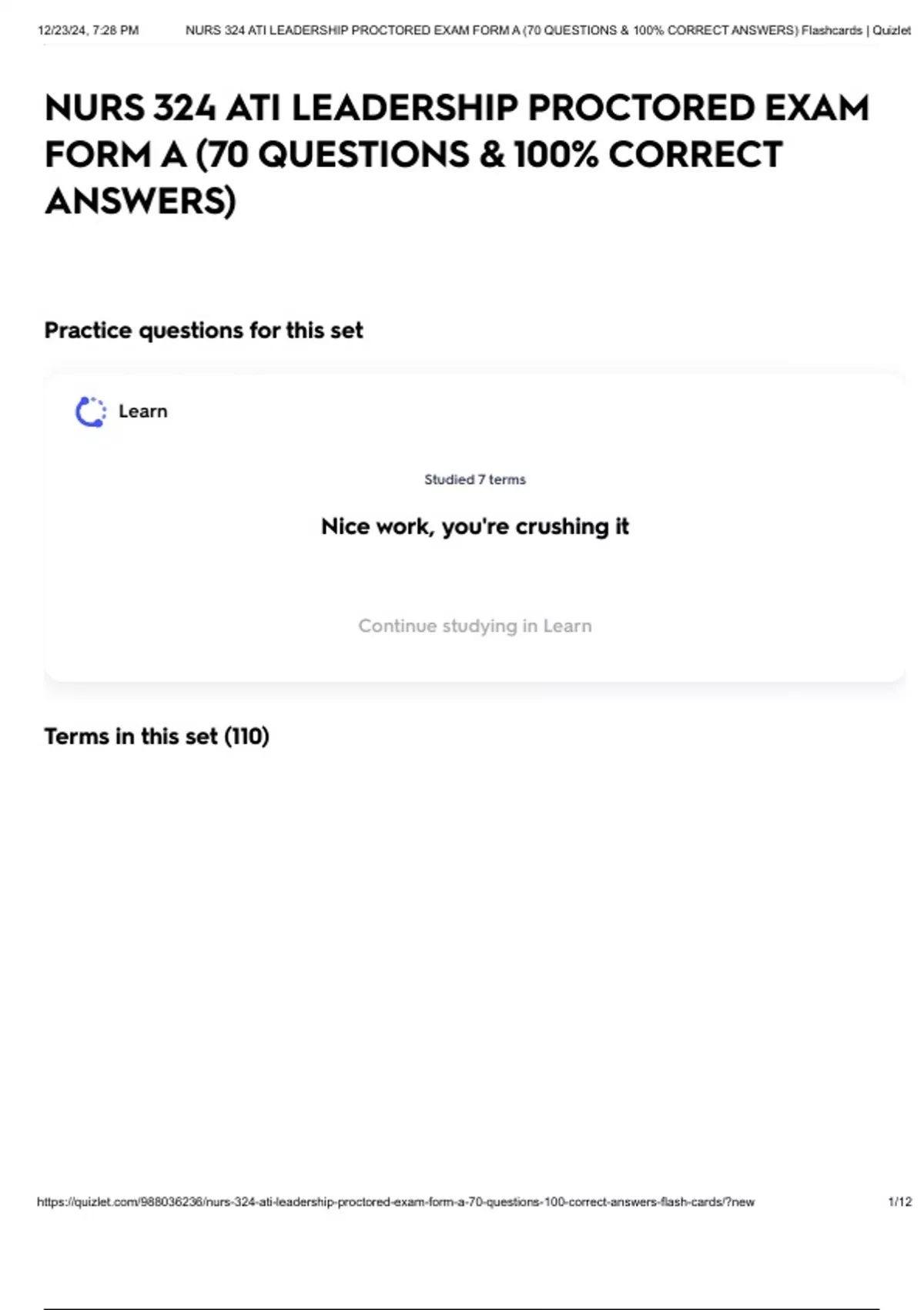 , 12/23/24, 7:28 PM NURS 324 ATI LEADERSHIP PROCTORED EXAM FORM A (70 QUESTIONS & 100% CORRECT ANSWERS) Flashcards | Quizlet