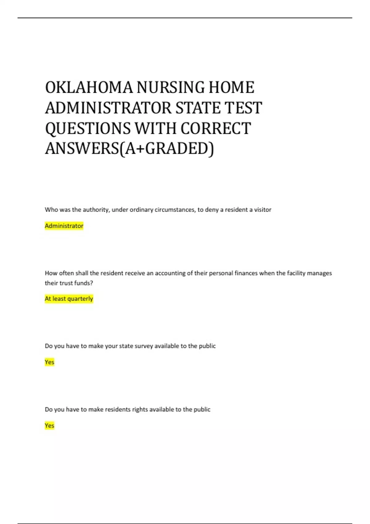OKLAHOMA NURSING HOME ADMINISTRATOR STATE TEST QUESTIONS WITH CORRECT ANSWERS(A+GRADED)