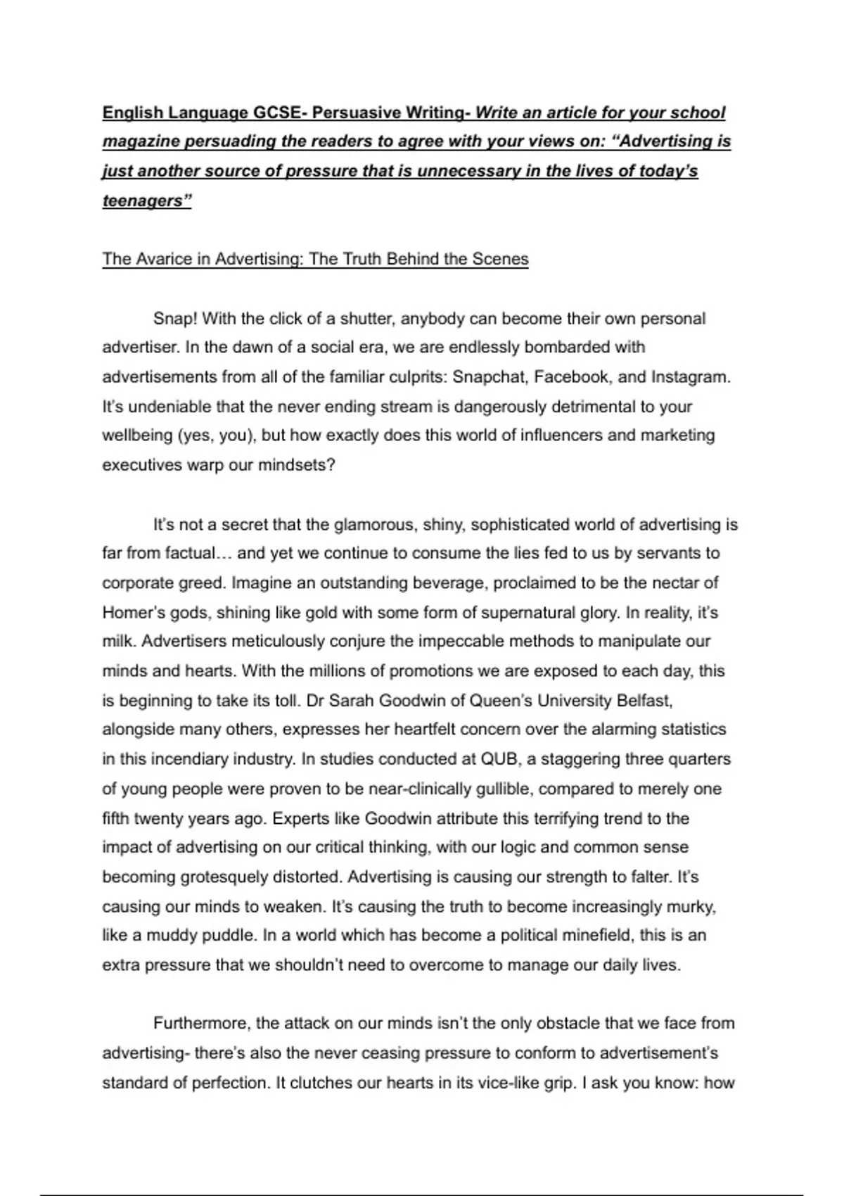 This is an essay for GCSE English Language. It's on the proposition "advertising is just another pressure that teenagers don't need". It received full marks and an A* grade. I've attached the essay, as well as my essay plan. Happy studying!