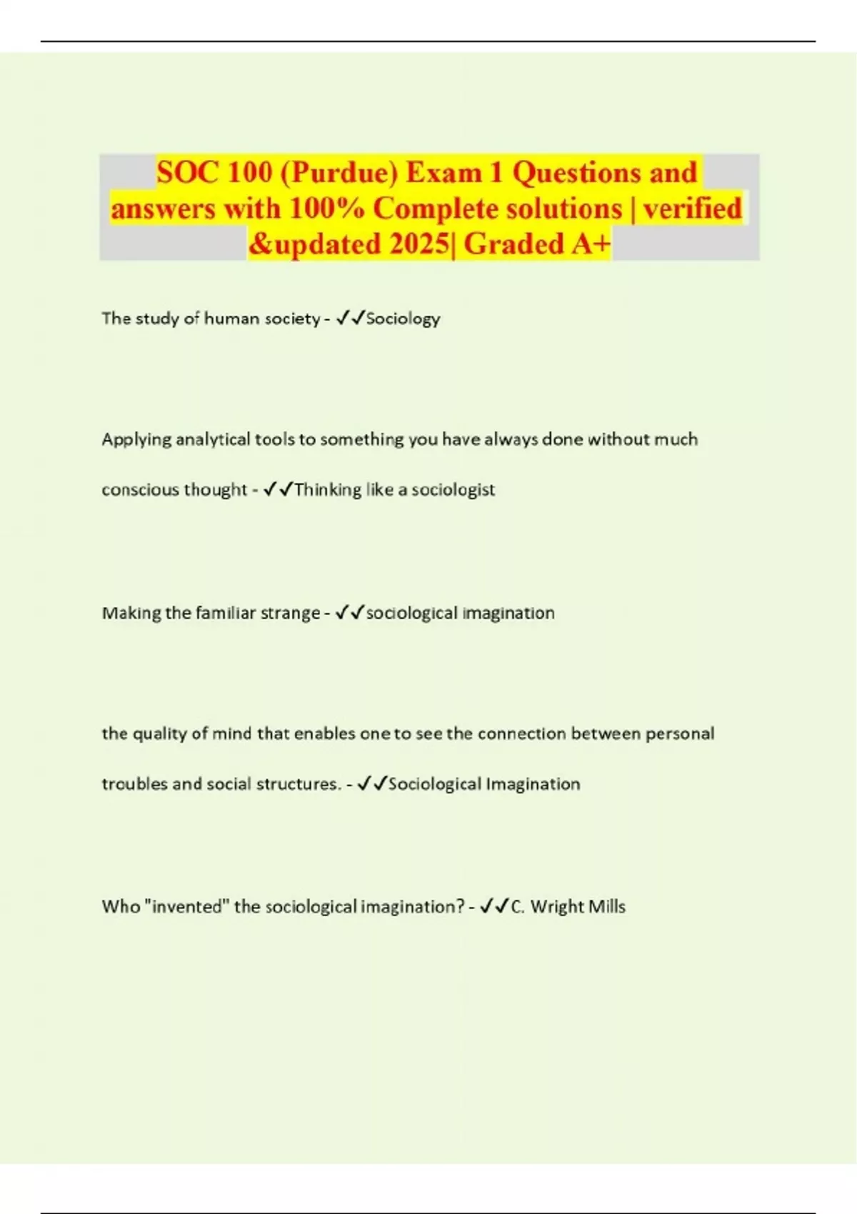 SOC 100 (Purdue) Exam 1 Questions and answers with 100% Complete solutions | verified &updated 2025| Graded A+