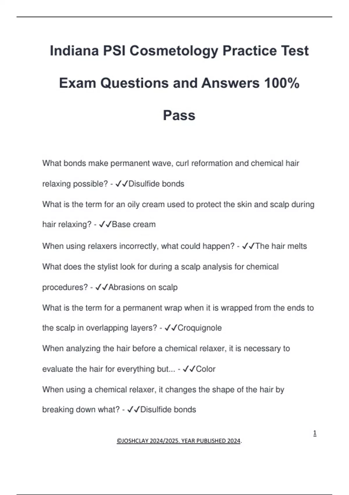 Indiana PSI Cosmetology Practice Test Exam Questions and Answers 100% Pass What bonds make permanent wave, curl reformation and chemical hair relaxing possible? - Disulfide bonds What is the term for an oily cream used to protect the skin and scalp during hair relaxing? - Base cream When using relaxers incorrectly, what could happen? - The hair melts What does the stylist look for during a scalp analysis for chemical procedures? - Abrasions on scalp What is the term for a permanent wrap when it is wrapped from the ends to the scalp in overlapping layers? - Croquignole When analyzing the hair before a chemical relaxer, it is necessary to evaluate the hair for everything but... - Color When using a chemical relaxer, it changes the shape of the hair by breaking down what? - Disulfide bonds