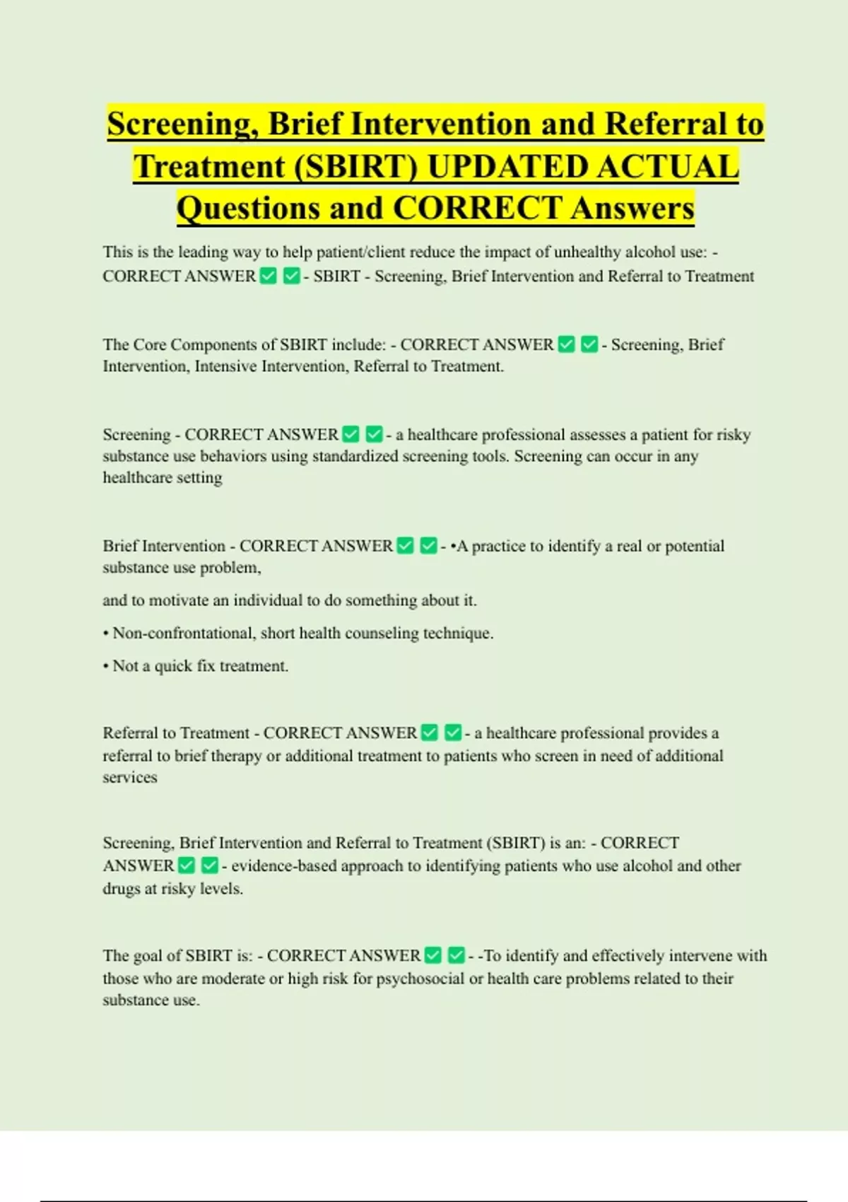 CORRECT ANSWER - SBIRT - Screening, Brief Intervention and Referral to Treatment