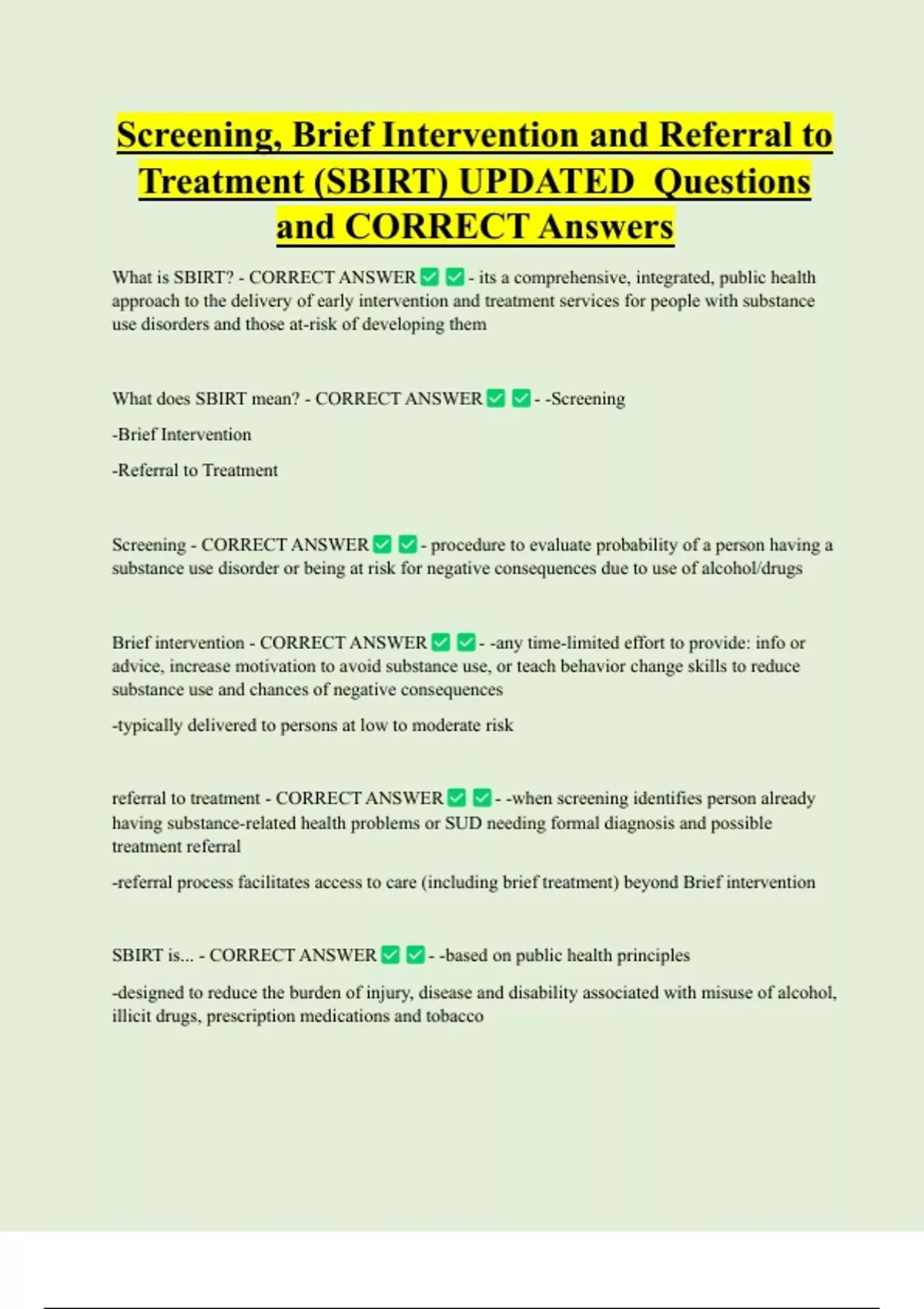 Screening, Brief Intervention and Referral to Treatment (SBIRT) UPDATED Questions and CORRECT Answers What is SBIRT? - CORRECT ANSWER - its a comprehensive, integrated, public health approach to the delivery of early intervention and treatment services for people with substance use disorders and those at-risk of developing them What does SBIRT mean? - CORRECT ANSWER - -Screenin