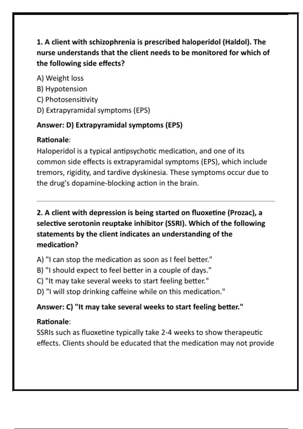 1. A client with schizophrenia is prescribed haloperidol (Haldol). The