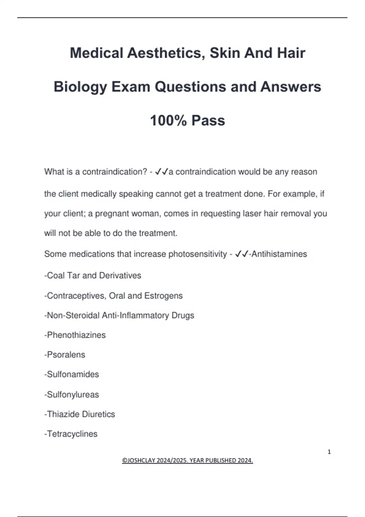 Medical Aesthetics, Skin And Hair Biology Exam Questions and Answers 100% Pass What is a contraindication? - a contraindication would be any reason the client medically speaking cannot get a treatment done. For example, if your client; a pregnant woman, comes in requesting laser hair removal you will not be able to do the treatment. Some medications that increase photosensitivity - -Antihistamines -Coal Tar and Derivatives -Contraceptives, Oral and Estrogens -Non-Steroidal Anti-Inflammatory Drugs -Phenothiazines -Psoralens -Sulfonamides -Sulfonylureas -Thiazide Diuretics -Tetracyclines