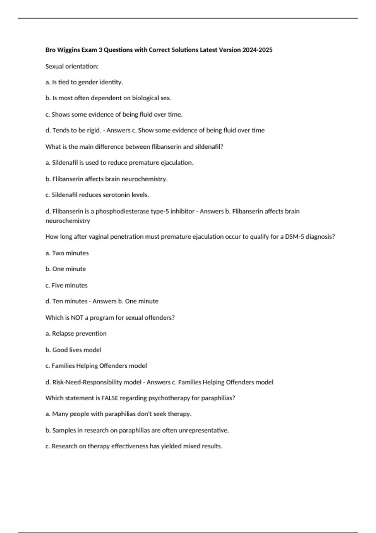 Bro Wiggins Exam 3 Questions with Correct Solutions Latest Version Sexual orientation: a. Is tied to gender identity. b. Is most often dependent on biological sex. c. Shows some evidence of being fluid over time. d. Tends to be rigid. - Answers c. Show some evidence of being fluid over time What is the main difference between flibanserin and sildenafil? a. Sildenafil is used to reduce premature ejaculation. b. Flibanserin affects brain neurochemistry. c. Sildenafil reduces serotonin levels. d. Flibanserin is a phosphodiesterase type-5 inhibitor - Answers b. Flibanserin affects brain neurochemistry How long after vaginal penetration must premature ejaculation occur to qualify for a DSM-5 diagnosis? a. Two minutes b. One minute c. Five minutes d. Ten minutes - Answers b. One minute Which is NOT a program for sexual offenders? a. Relapse prevention b. Good lives model c. Families Helping Offenders model d. Risk-Need-Responsibility model - Answers c. Families Helping Offenders model Which statement is FALSE regarding psychotherapy for paraphilias? a. Many people with paraphilias don't seek therapy. b. Samples in research on paraphilias are often unrepresentative. c. Research on therapy effectiveness has yielded mixed results. d. Some therapies are effective, but CBT clearly is not. - Answers d. Some therapies are effective, but CBT clearly is not Which example best supports the idea that immune system issues can affect sexual functioning. a. Salvador has rheumatoid arthritis. b. Jennie has too much serotonin. c. William has tumescence issues. d. Karen has Klinefelter syndrome. - Answers a. Salvador has rheumatoid arthritis Which is NOT a stage of the sexual response cycle? a. Excitement/arousal b. Plateau c. Orgasm d. Retrieval - Answers d. Retrieval What is the difference between sex and gender? a. Sex refers to biology, while gender refers to attitudes and behaviors. b. Gender refers to biology, while sex refers to attitudes and behaviors. c. Nothing, and sex and gender may be used interchangeably. d. Sex is a cultural construct, while gender is rigid and cannot be changed. - Answers a. Sex refers to biology, while gender refers to attitudes and behaviors What is spectatoring? a. The tendency of voyeurs to watch other people engaged in sexual activity. b. An excessive sexual desire that causes men to prematurely ejaculate. c. The tendency to observe and negatively evaluate one's own sexual performance. d. The behavior of sexologists observing human sexual response for research purposes. - Answers c. The tendency to observe and negatively evaluate one's own sexual performance Gender dysphoria is to as gender incongruence is to . a. DSM-5; ICD-11 b. ICD-11; DSM-5 c. DSM-5; ICD-10 d. ICD-10; DSM-5 - Answers a. DSM-5, ICD-11 In intracavernous injection therapy: a. Sildenafil plays a central role in increasing sexual arousal. b. Chemicals are injected directly into the penis to increase blood flow. c. The hippocampus is targeted to increase sexual memory. d. Spectatoring is addressed via weekly injections. - Answers b. Chemicals are injected directly into the penis to increase blood flow Which of the following is the DSM-5 disorder that combines elements of vaginismus and dyspareunia? a. Paraphilic disorder b. Female sexual interest/arousal disorder c. Orgasmic disorder d. Genito-pelvic pain/penetration disorder - Answers d. Genito-pelvic pain/penetration disorder According to psychodynamic therapist Robert Stoller, the key element of paraphilias is that they are _______. a. sexual fantasies directed at inanimate objects b. ways of expressing grief c. acts of revenge d. the result of the ego turned inward. - Answers c. Acts of revenge What does gatekeeping do? a. Keeps people from making irreversible gender-altering decisions. b. Discourages transgender people from seeking transgender affirmative therapy. c. Stops clinicians from diagnosing people with gender dysphoria. d. Prevents transgender individuals from moving into the neighborhood. - Answers a. Keeps people from making irreversible gender-altering decisions What do all sexual disorders have in common? a. They are universally agreed upon to be dysfunctional. b. They require the client to be distressed and/or to have acted upon the sexual urges. c. They are grouped under paraphilias in the DSM. d. They cannot be diagnosed without marked distress in the client. - Answers b. They require the client to be distressed and/or to have acted upon the sexual urges Focusing on the meaning of sex rather than on eliminating dysfunctional interests and activities is the key emphasis of _______. a. trangender-affirmative therapy b. narrative sex therapy c. the New View d. experiential sex therapy - Answers d. experiential sex therapy Choose the question that best reflects a family systems approach. a. "What are you thinking about during sex?" b. "How are you and your partner getting along?" c. "What happened in your partner's past?" d. "Are you and your partner married?" - Answers b. "How are you and your partner getting along?" A person with exhibitionism is asked to imagine getting arrested for exposing himself in public. He is undergoing what therapy? a. Covert sensitization b. Masturbatory inhibition c. Olfactory aversive therapy d. Pelvic floor rehabilitation - Answers a. Covert sensitization What is conversion therapy? a. A therapy for converting pedophilia into normal sexual behavior. b. A therapy for restoring sexual interest in those with sexual aversion disorders. c. A therapy for making homosexuals into heterosexuals. d. A therapy for alleviating sexual pain disorders. - Answers c. A therapy for making homosexuals into heterosexuals Which statement best represents the New View perspective? a. Transaffirmative therapy is more progressive and helpful than older therapies. b. Women's sexual dysfunctions are too often treated as strictly medical problems. c. Too often, women engage in harmful spectatoring when it comes to sex. d. To destigmatize