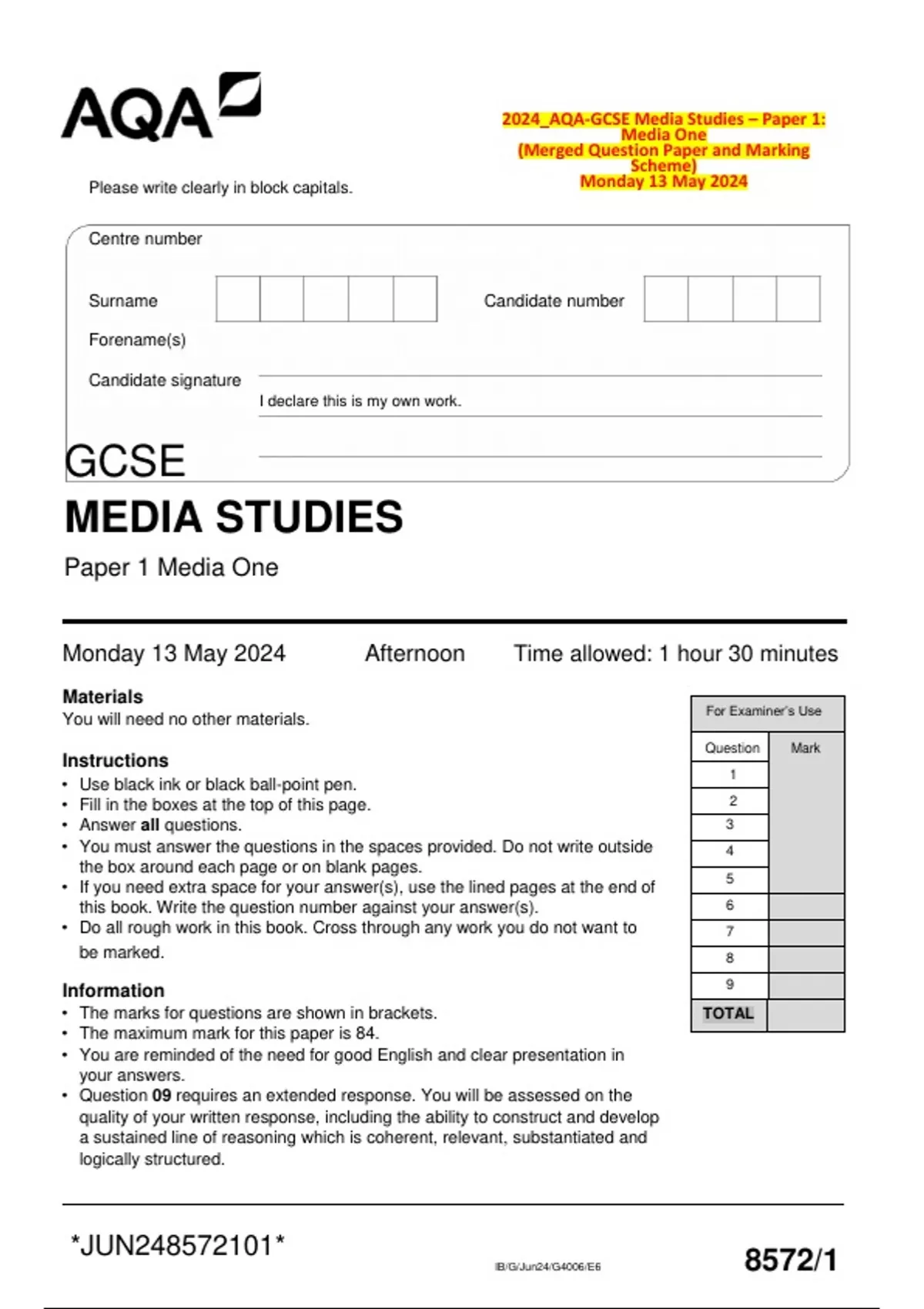 The GCSE Media Studies Paper 1: Media One is scheduled for May 2025. This paper assesses b