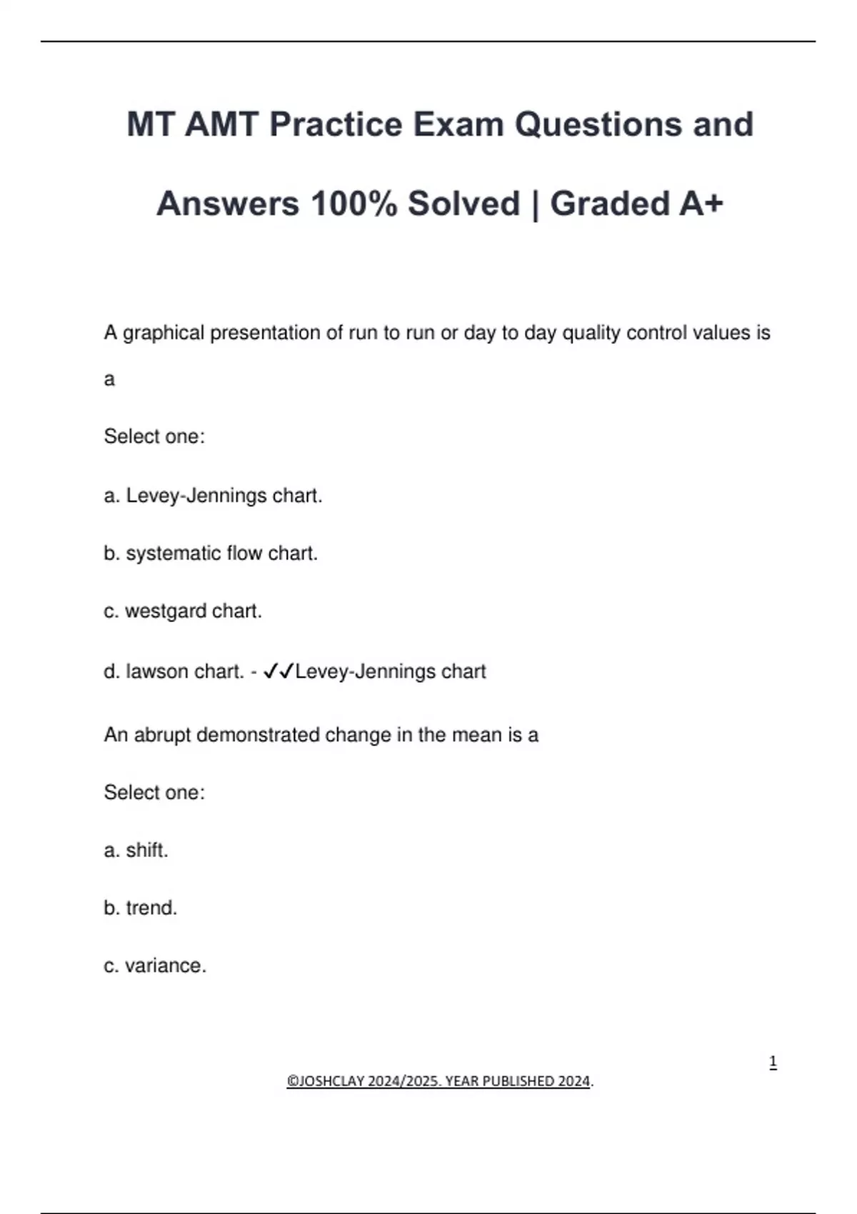 MT AMT Practice Exam Questions and Answers 100% Solved | Graded A+ A graphical presentation of run to run or day to day quality control values is a Select one: a. Levey-Jennings chart. b. systematic flow chart. c. westgard chart. d. lawson chart. - Levey-Jennings chart An abrupt demonstrated change in the mean is a Select one: a. shift. b. trend. c. variance.