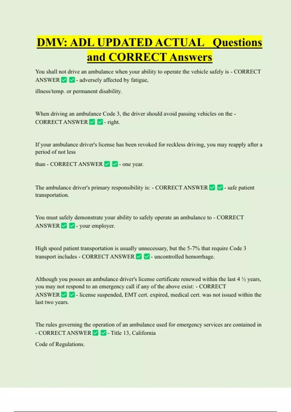 You may not operate an unsafe ambulance at - CORRECT ANSWER - any time.