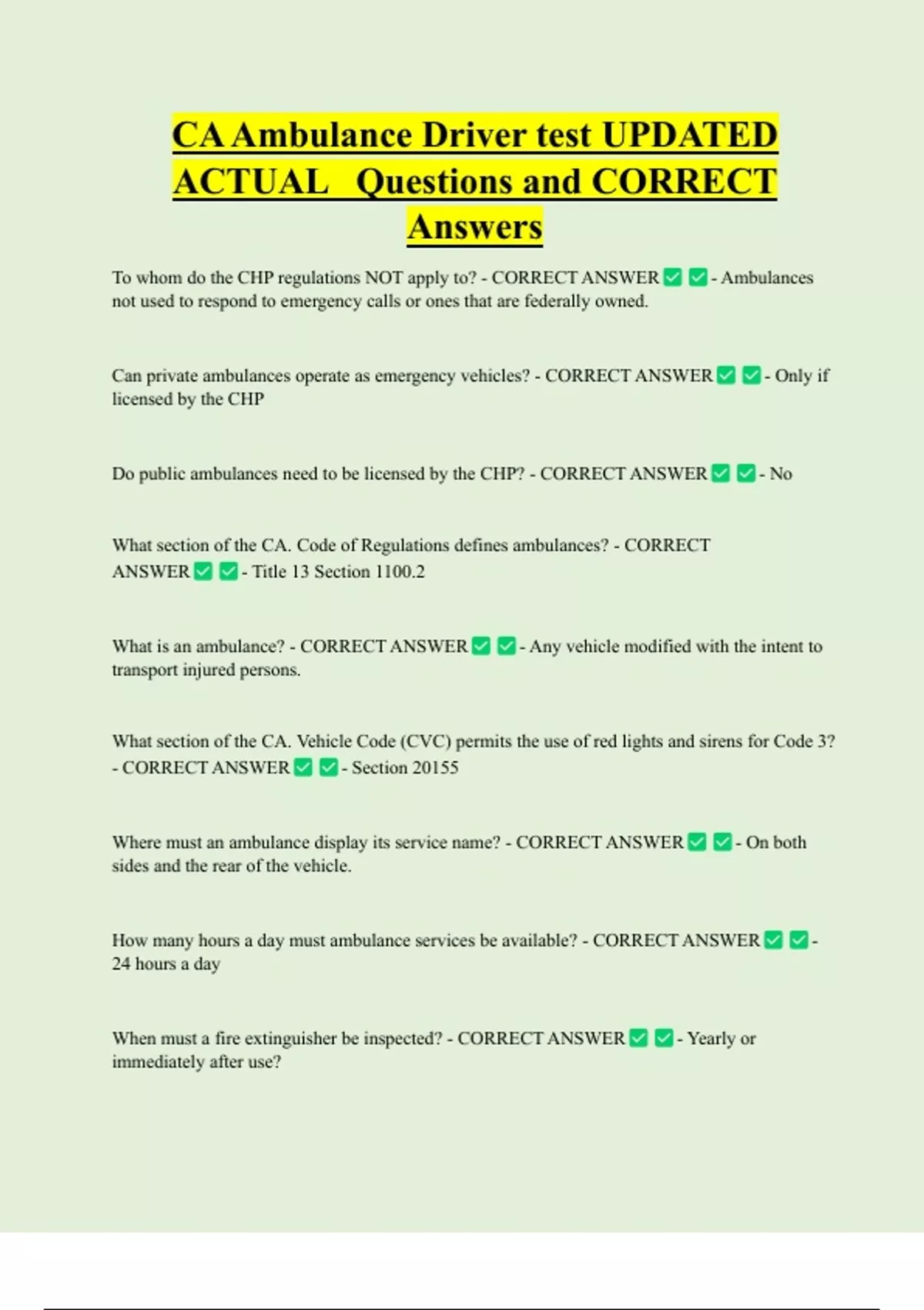 CA Ambulance Driver test UPDATED ACTUAL Questions and CORRECT Answers To whom do the CHP regulations NOT apply to? - CORRECT ANSWER - Ambulances not used to respond to emergency calls or ones that are federally owned. Can private ambulances operate as emergency vehicles? - CORRECT ANSWER - Only if licensed by the CHP