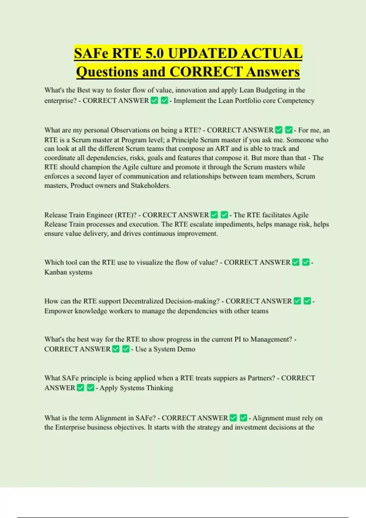 SAFe RTE 5.0 UPDATED ACTUAL Questions and CORRECT Answers What's the Best way to foster flow of value, innovation and apply Lean Budgeting in the enterprise? - CORRECT ANSWER - Implement the Lean Portfolio core Competency What are my personal Observations on being a RTE? - CORRECT ANSWER - For me, an RTE is a Scrum master at Program level; a Principle Scrum master if you ask me. Someone who can look at all the different Scrum teams that compose an ART and is able to track and coordinate all dependencies, risks, goals and features that compose it. But more than that - The RTE should champion the Agile culture and promote it through the Scrum masters while enforces a second layer of communication and relationships between team members, Scrum masters, Product owners and Stakeholders