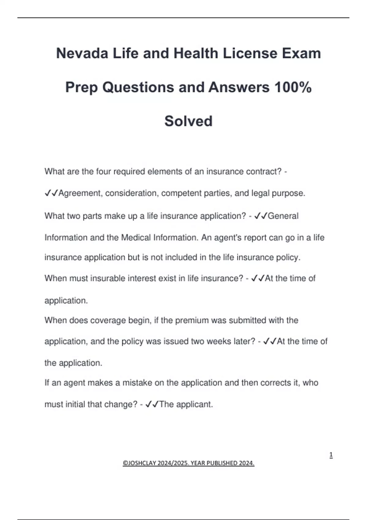 Nevada Life and Health License Exam Prep Questions and Answers 100% Solved What are the four required elements of an insurance contract? - Agreement, consideration, competent parties, and legal purpose. What two parts make up a life insurance application? - General Information and the Medical Information. An agent's report can go in a life insurance application but is not included in the life insurance policy. When must insurable interest exist in life insurance? - At the time of application. When does coverage begin, if the premium was submitted with the application, and the policy was issued two weeks later? - At the time of the application. If an agent makes a mistake on the application and then corrects it, who must initial that change? - The applicant