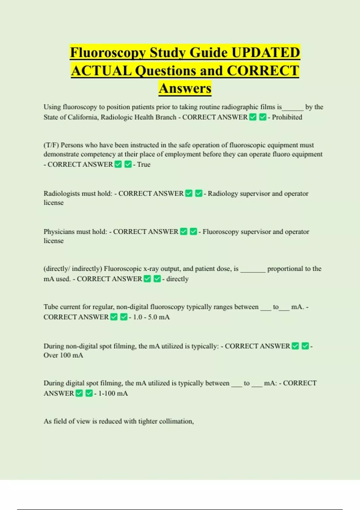 Fluoroscopy Study Guide UPDATED ACTUAL Questions and CORRECT Answers
