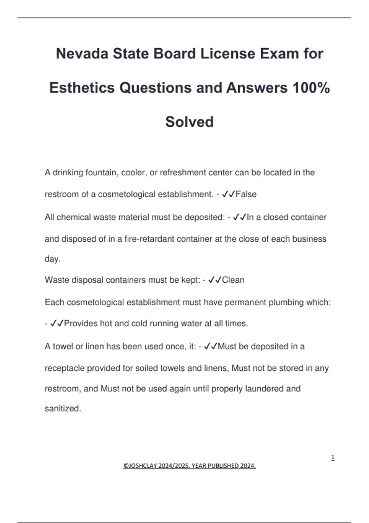 Nevada State Board License Exam for Esthetics Questions and Answers 100% Solved A drinking fountain, cooler, or refreshment center can be located in the restroom of a cosmetological establishment. - False All chemical waste material must be deposited: - In a closed container and disposed of in a fire-retardant container at the close of each business day. Waste disposal containers must be kept: - Clean Each cosmetological establishment must have permanent plumbing which: - Provides hot and cold running water at all times. A towel or linen has been used once, it: - Must be deposited in a receptacle provided for soiled towels and linens, Must not be stored in any restroom, and Must not be used again until properly laundered and sanitized.