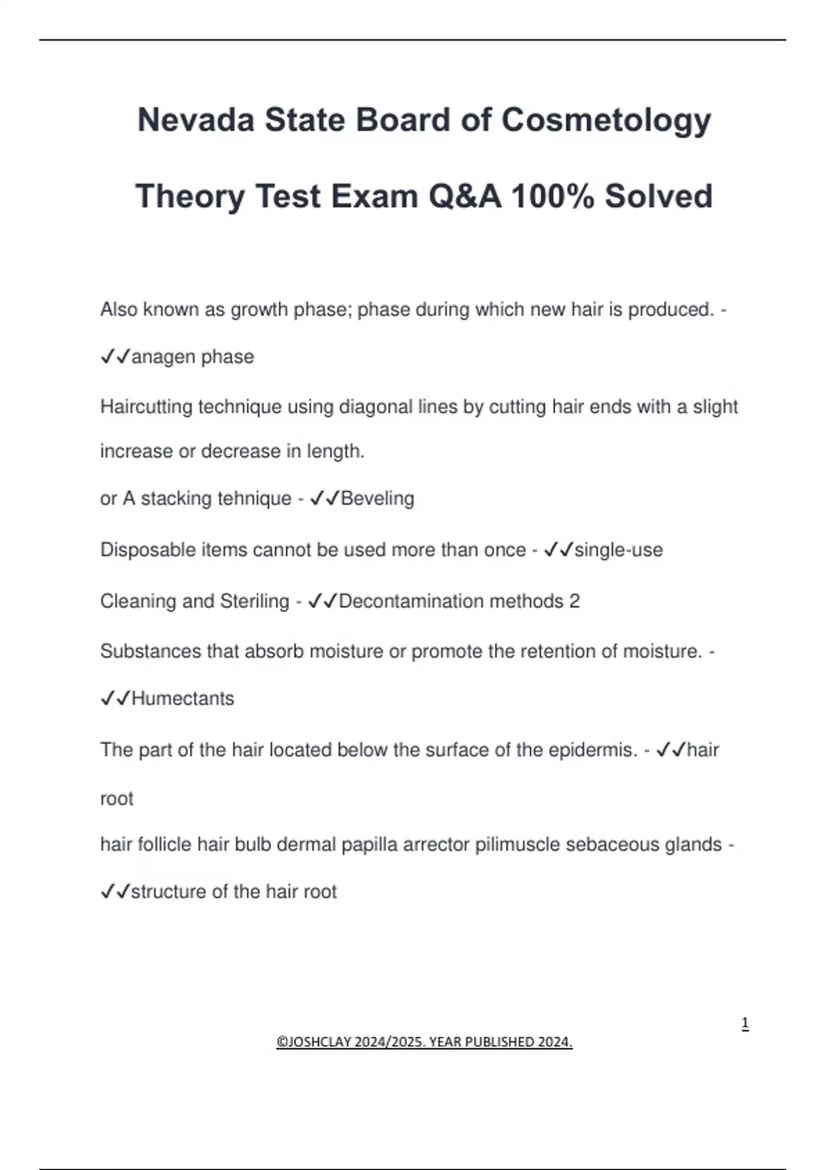 Nevada State Board of Cosmetology Theory Test Exam Q&A 100% Solved Also known as growth phase; phase during which new hair is produced. - anagen phase Haircutting technique using diagonal lines by cutting hair ends with a slight increase or decrease in length. or A stacking tehnique - Beveling Disposable items cannot be used more than once - single-use Cleaning and Steriling - Decontamination methods 2 Substances that absorb moisture or promote the retention of moisture. - Humectants The part of the hair located below the surface of the epidermis. - hair root hair follicle hair bulb dermal papilla arrector pilimuscle sebaceous glands - structure of the hair root