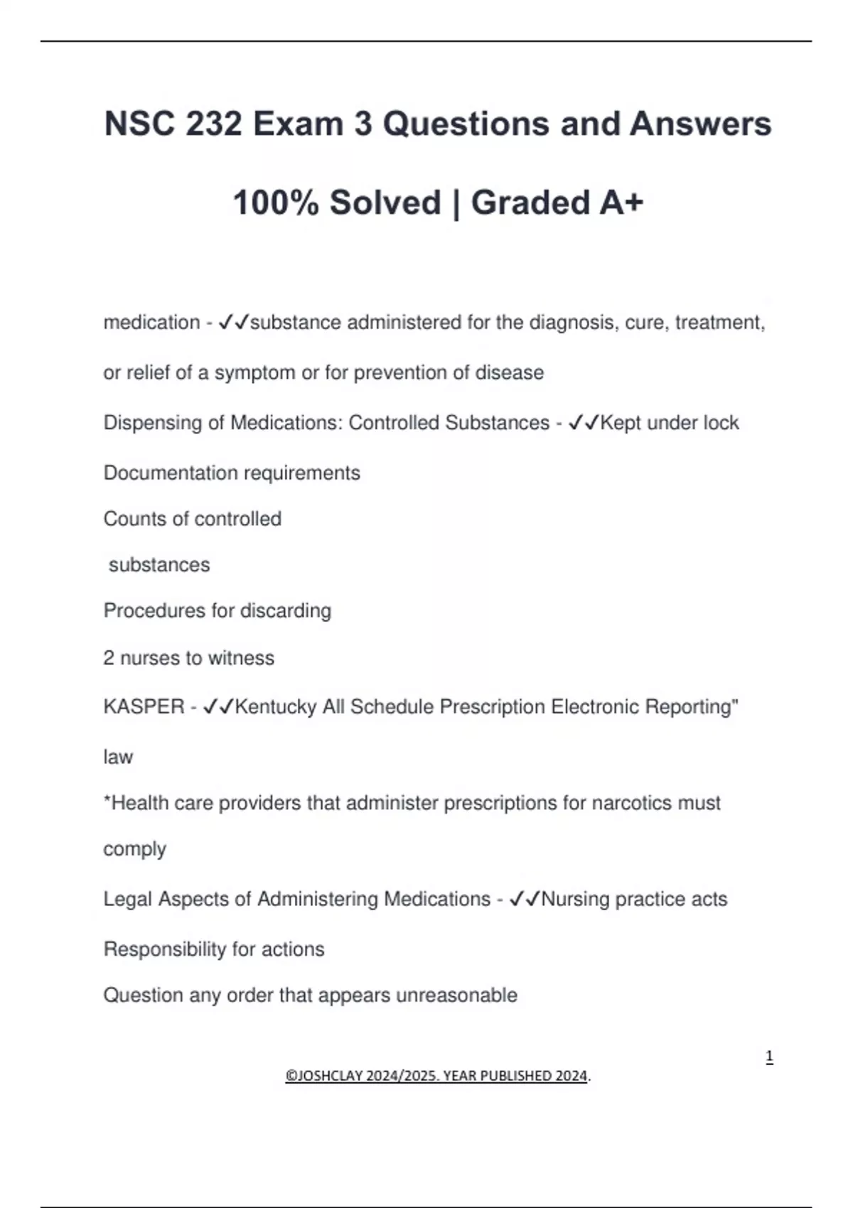 NSC 232 Exam 3 Questions and Answers 100% Solved | Graded A+ medication - substance administered for the diagnosis, cure, treatment, or relief of a symptom or for prevention of disease Dispensing of Medications: Controlled Substances - Kept under lock Documentation requirements Counts of controlled substances Procedures for discarding 2 nurses to witness KASPER - Kentucky All Schedule Prescription Electronic Reporting" law *Health care providers that administer prescriptions for narcotics must comply Legal Aspects of Administering Medications - Nursing practice acts Responsibility for actions Question any order that appears unreasonable
