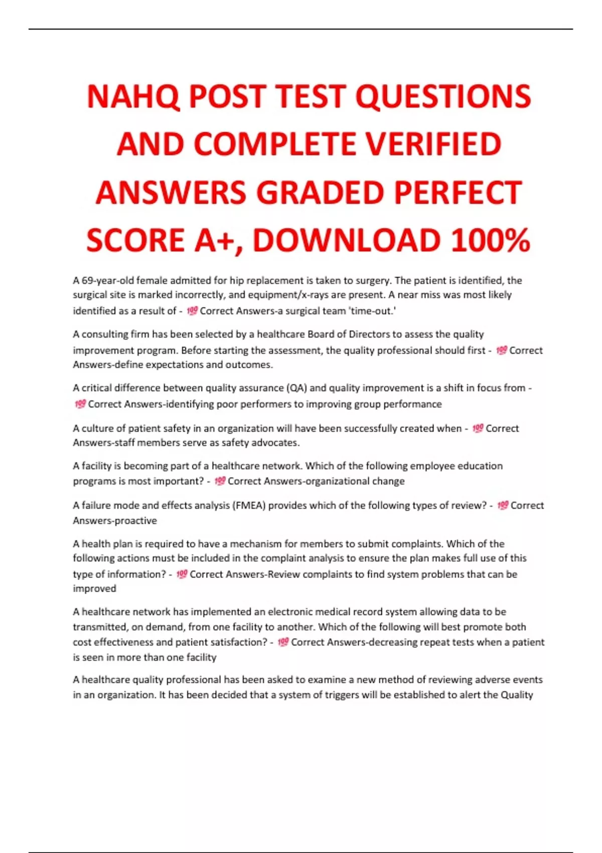 NAHQ POST TEST QUESTIONS AND COMPLETE VERIFIED ANSWERS GRADED PERFECT SCORE A+, DOWNLOAD 100%