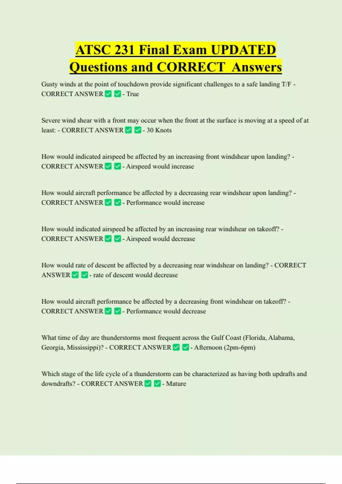ATSC 231 Final Exam UPDATED Questions and CORRECT Answers Gusty winds at the point of touchdown provide significant challenges to a safe landing T/F - CORRECT ANSWER - True Severe wind shear with a front may occur when the front at the surface is moving at a speed of at least: - CORRECT ANSWER - 30 Knots