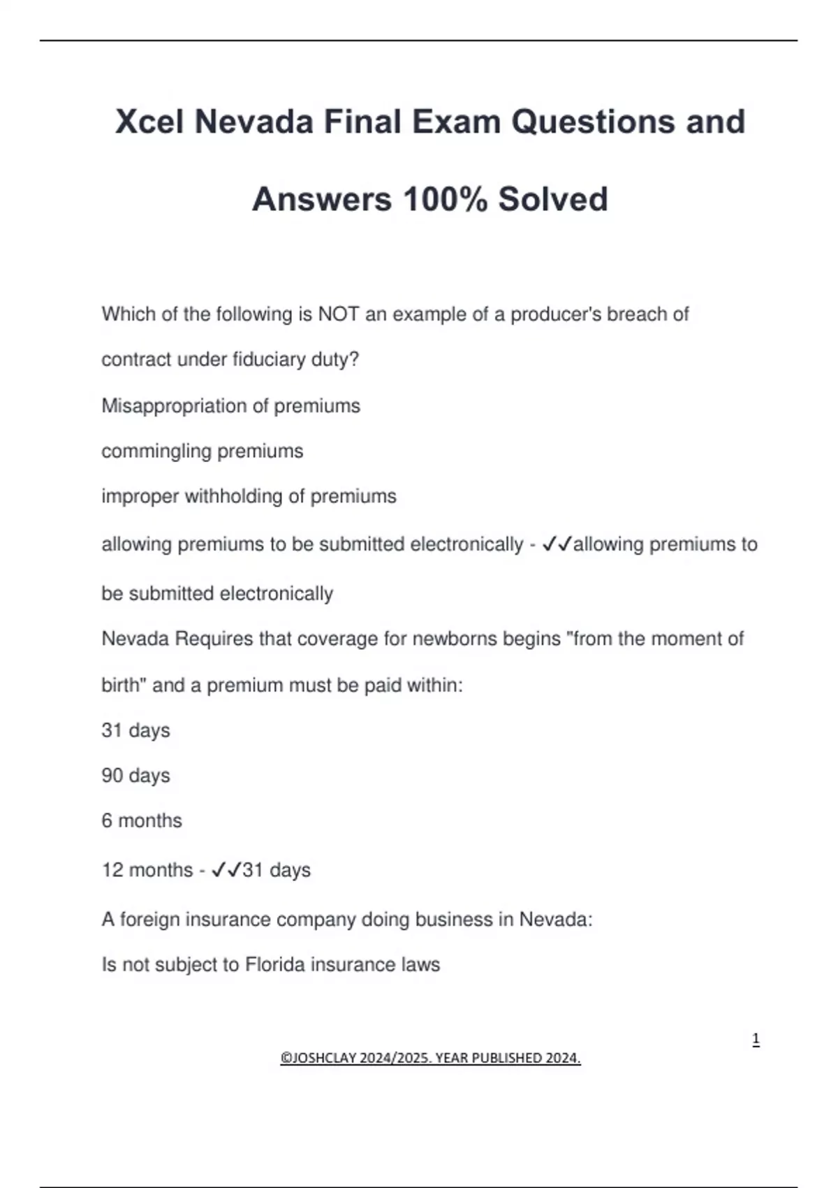 Xcel Nevada Final Exam Questions and Answers 100% Solved Which of the following is NOT an example of a producer's breach of contract under fiduciary duty? Misappropriation of premiums commingling premiums improper withholding of premiums allowing premiums to be submitted electronically - allowing premiums to be submitted electronically Nevada Requires that coverage for newborns begins "from the moment of birth" and a premium must be paid within: 31 days 90 days 6 months 12 months - 31 days A foreign insurance company doing business in Nevada: Is not subject to Florida insurance laws