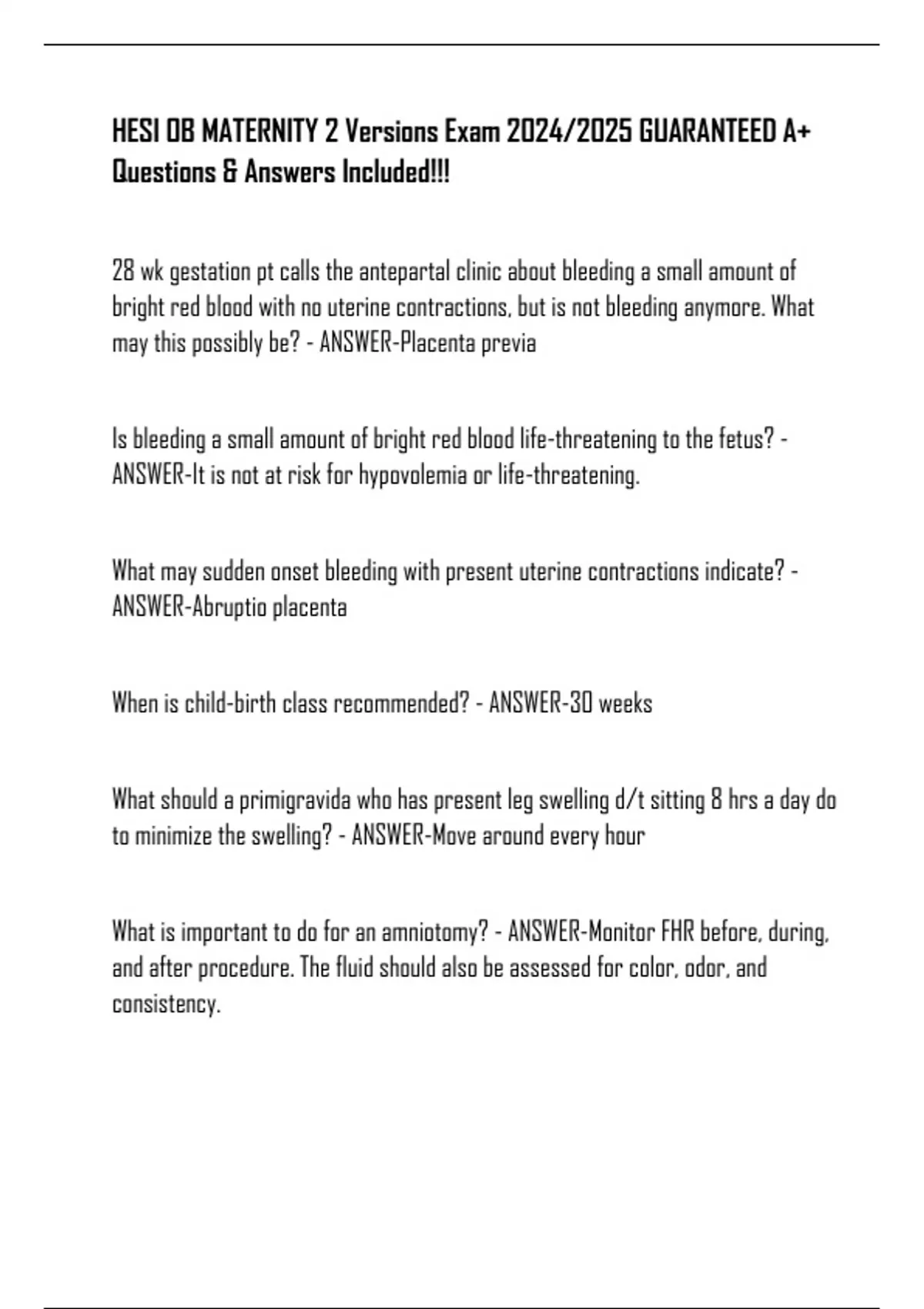 HESI OB MATERNITY 2 Versions Exam 2024/2025 GUARANTEED A+ Questions & Answers Included!!! 28 wk gestation pt calls the antepartal clinic about bleeding a small amount of bright red blood with no uterine contractions, but is not bleeding anymore. What may this possibly be? - ANSWER-Placenta previa Is bleeding a small amount of bright red blood life-threatening to the fetus? - ANSWER-It is not at risk for hypovolemia or life-threatening. What may sudden onset bleeding with present uterine contractions indicate? - ANSWER-Abruptio placenta When is child-birth class recommended? - ANSWER-30 weeks What should a primigravida who has present leg swelling d/t sitting 8 hrs a day do to minimize the swelling? - ANSWER-Move around every hour What is important to do for an amniotomy? - ANSWER-Monitor FHR before, during, and after procedure. The fluid should also be assessed for color, odor, and consistency. When is an amniotomy indicated? - ANSWER-(artificial rupture of membranes [AROM]) is used to stimulate labor when the condition of the cervix is favorable