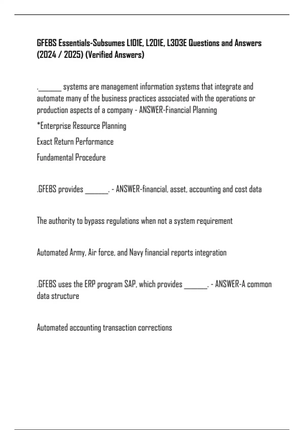 GFEBS Essentials-Subsumes L101E, L201E, L303E Questions and Answers (2024 / 2025) (Verified Answers) ._______ systems are management information systems that integrate and automate many of the business practices associated with the operations or production aspects of a company - ANSWER-Financial Planning *Enterprise Resource Planning Exact Return Performance Fundamental Procedure .GFEBS provides _______. - ANSWER-financial, asset, accounting and cost data The authority to bypass regulations when not a system requirement Automated Army, Air force, and Navy financial reports integration .GFEBS uses the ERP program SAP, which provides _______. - ANSWER-A common data structure Automated accounting transaction corrections
