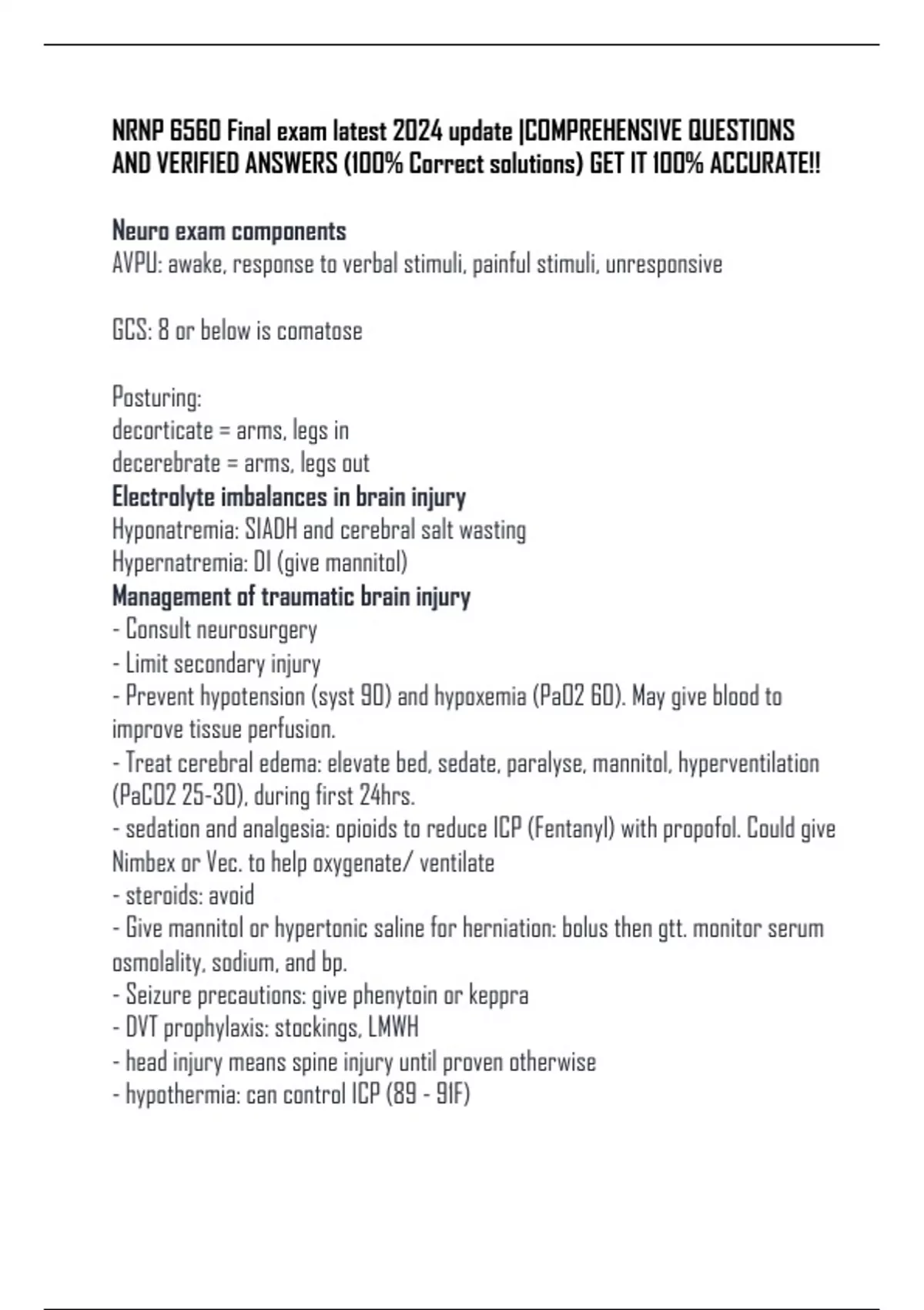 - Treat cerebral edema: elevate bed, sedate, paralyse, mannitol, hyperventilation