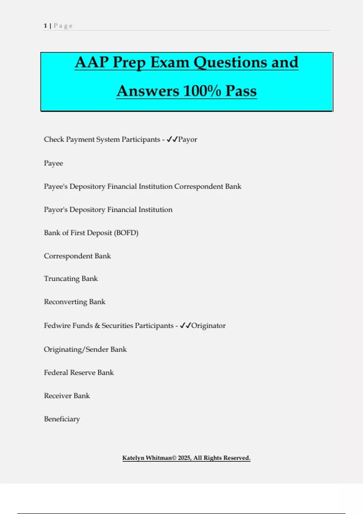 AAP Prep Exam Questions and Answers 100% Pass Check Payment System Participants - Payor Payee Payee's Depository Financial Institution Correspondent Bank Payor's Depository Financial Institution Bank of First Deposit (BOFD) Correspondent Bank Truncating Bank Reconverting Bank Fedwire Funds & Securities Participants - Originator Originating/Sender Bank Federal Reserve Bank Receiver Bank Beneficiary 2 | P a g e Katelyn Whitman© 2025, All Rights Reserved. Card Payment Participants - Card Holder Card Issuer Merchant Acquirer POS/ATM Credit Card Network ACH Network Participants - Originator (Company, Employer, Consumer) ODFI Originating ACH Operator Receiving ACH Operator RDFI Receiver (Company, Employee, Consumer) Check System - Legal Framework - UCC Article 3 (gov checks - layout) UCC Article 4 (gov check collection) Reg CC (funds availability) Reg J (est. proc. for the interbank system of collecting checks) Check 21(govs substitue checks/IRD's) FRB Op Circular 3 3 | P a g e Katelyn Whitman© 2025, All Rights Reserved. ECCHO Rules (Electronic Check Clearing House Org) NACHA Op Rules Fedwire Funds Service - Legal Framework - Federal Reserve Act Sections 11 & 13 Reg J -subpart B UCC Article 4A FRB Op Circulars 1, 5, & 6 Reg CC BSA - 31 CFR 103 (recordkpng req/trav rule) OFAC Regs Fedwire Securities Service Legal Framework - Federal Reserve Act Sections 11 & 15 TRADES and Agency Regulations UCC Articles 8 & 9 FRB Op Circulars 1, 5, & 7 Card Legal Framework - Reg E Reg Z Req & responsibilities fo a participant in a POS or ATM network are governed by the "rules covering the POS or ATM network" to which the participant belongs. 4 | P a g e Katelyn Whitman© 2025, All Rights Reserved. ACH Legal Framework - ACH/NACHA Operating Rules Book Federal Reserve Op Circular 4 Reg E (EFTA) UCC Article 4 (check law) & UCC Article 4A (corp cr-varies by state-ccd ctx) Title 31 CFR Part 210 (Green Book) Reg D (acct requirements) Reg CC (ck clearing/funds availability) BSA/Right to Fin Privacy Act OCC Circular 235 (national banks-risk guides) OFAC Define MICR - Magnetic Ink Character Recognition How many types of checks are there & what are they? - Two
