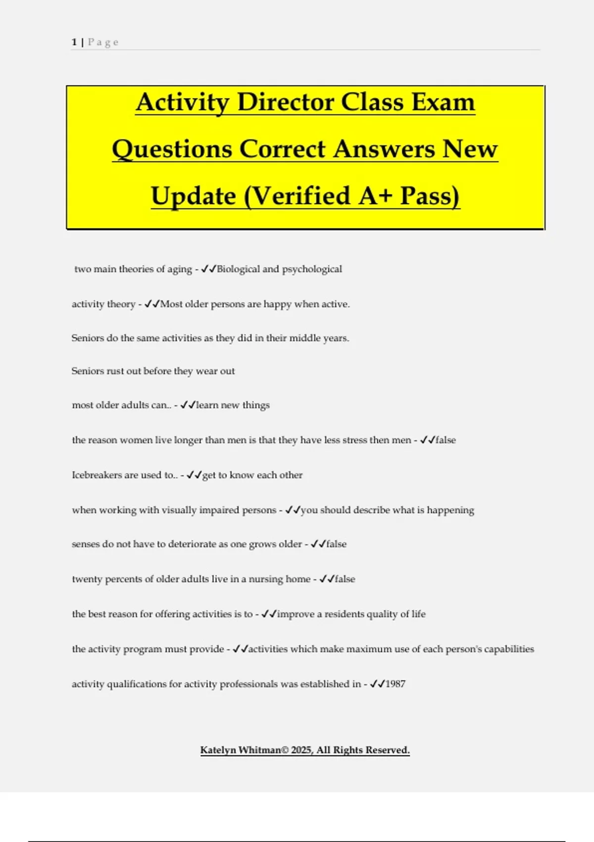 Activity Director Class Exam Questions Correct Answers New Update (Verified A+ Pass) two main theories of aging - Biological and psychological activity theory - Most older persons are happy when active. Seniors do the same activities as they did in their middle years. Seniors rust out before they wear out most older adults can.. - learn new things the reason women live longer than men is that they have less stress then men - false Icebreakers are used to.. - get to know each other when working with visually impaired persons - you should describe what is happening senses do not have to deteriorate as one grows older - false twenty percents of older adults live in a nursing home - false the best reason for offering activities is to - improve a residents quality of life the activity program must provide - activities which make maximum use of each person's capabilities activity qualifications for activity professionals was established in - 1987 2 | P a g e Katelyn Whitman© 2025, All Rights Reserved. a key aspect of an activity director is to delegate - true the environment is the most important part of improving part a residents quality of life - false if possible the way to understand an individual is to interview them - true Expressive activities - exercise to music dance music drama and art painting, ceramics, and plaster of Paris emphasis on individuality and communication characteristics of depression are anger and pessimism - true activity directors should not delegate duties to others - false all 15 activity categories should be included in every activity department - true when planning an activity programs the director should - develop department goals and steps to accomplish them AD's should come up with clever names for the activity - true planning is the most important part of a successful activity - true first and foremost, activities should - be meaningful 5 aspects of an individual's personality - physical emotional mental social 3 | P a g e Katelyn Whitman© 2025, All Rights Reserved. spiritual a total activity program does not meet all aspects of a total personally - false what is the abbreviation for the governing body in order to become nationally certified - NCCAP what does NAAP stand for - national association of Activities professionals list two community resources - school church why does the AD need a support system - burnout is highly likely what is one way to get support from a spouse/significant other - involve in the events what are the 4 stages of validation therapy and list them in order from stage one to stage four - malorientation time confusion repetitive movement vegetation validation therapy - The caregiver accepts values and beliefs of the resident with dementia, even though they may differ from reality reality orientation - method of care used to promote awareness of reality in confu