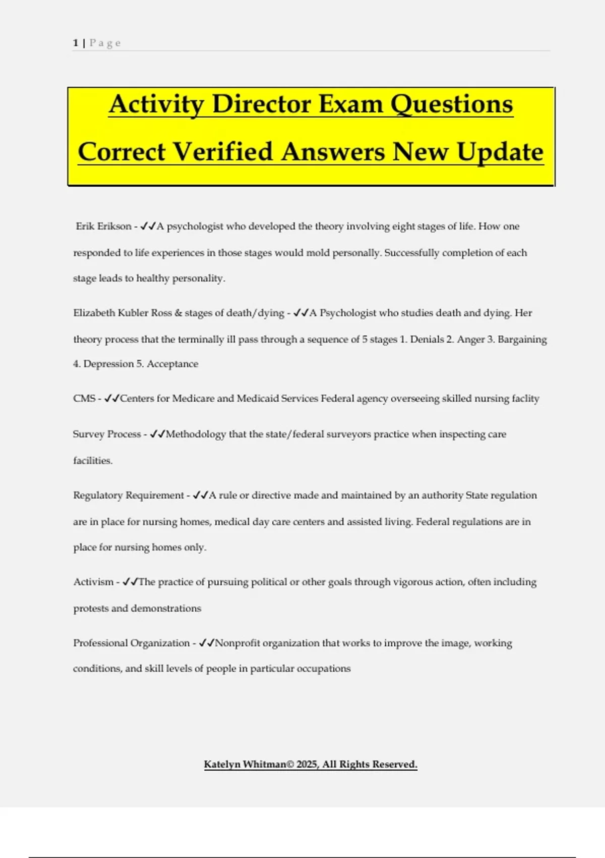 Activity Director Exam Questions Correct Verified Answers New Update Erik Erikson - A psychologist who developed the theory involving eight stages of life. How one responded to life experiences in those stages would mold personally. Successfully completion of each stage leads to healthy personality. Elizabeth Kubler Ross & stages of death/dying - A Psychologist who studies death and dying. Her theory process that the terminally ill pass through a sequence of 5 stages 1. Denials 2. Anger 3. Bargaining 4. Depression 5. Acceptance CMS - Centers for Medicare and Medicaid Services Federal agency overseeing skilled nursing faclity Survey Process - Methodology that the state/federal surveyors practice when inspecting care facilities. Regulatory Requirement - A rule or directive made and maintained by an authority State regulation are in place for nursing homes, medical day care centers and assisted living. Federal regulations are in place for nursing homes only. Activism - The practice of pursuing political or other goals through vigorous action, often including protests and demonstrations Professional Organization - Nonprofit organization that works to improve the image, working conditions, and skill levels of people in particular occupations 2 | P a g e Katelyn Whitman© 2025, All Rights Reserved. Deficiency - In LTC this is something the state surveyors find during a survey. It means the facility has not met the state or federal standard Protesting - to object,complain or disagree with something Advocacy - To act, speak =, or write in support of an issue Certification - A credential indicating specific training in a career specialty. Quality Assurance (QA) - A process of evaluating a service to ensure the goals of the service are being met. Total Quality Management (TQM) - the philosophy that everyone in the organization is concerned about quality, throughout all of the firm's activities, to better serve customer needs QAPI Quality Assurance Performance Improvement - A federally mandated quality assurance process for skilled nursing facilities. Judegement - Making a decision or drawing a conclusion from data collected Norms and Expectaions - Specific standard s or definitions of what is to be found when conducteding an evaluation or QPAI Cohort Effect - Consequences of having been born in a given year and having grown up during a particular time period with it's own unique pressures problems, challenges and opportunities. The Spirit of life - The force within the body that gives life energy and power. Autonomy - Independence/ Ability or tendency to function independently Fluid Intelligence - Capacity to learn new ways of solving problems Medical Model - the concept that diseases have physical causes that can be diagnosed, treated, and, in most cases, cured. When applied to psychological disorders, the medical model assumes that these 3 | P a g e Katelyn Whitman© 2025, All Rights Reserved. mental illnesses can be diagnosed on the basis of their symptoms and cured through therapy, which may include treatment in a psychiatric hospital. Metamessages are defined by Dr. Deborah Tannen as: - Indirectness of one's actual intention to communicate/underlying message of what is being said Long Term Care Model - Continuous care over longer time Restorative Model - Program based on restoring each patients function level. Based on ADL's assessment made based on the individual capability to perform Re-motivation therapy - Five step group process designed for individuals in a depressed state or in early stages of dementia. Utilizes real objects, stimulate senses, and encourages a new motivation for life, uitilizing poems, pictures animals, hobbies, group interaction. Culture Change - An ongoing transformation within long term care communities which is based on person directed values that restore control to the elder. Culture change codes include the Eden Alternative and the Greenhouse Model. Crystallized Intelligence - our accumulated knowledge and verbal skills; tends to increase with age VALIDATION Therapy - Founded by Naomi Feil - focuses on accepting the resident where they are and joining their world. An empathetic approach Person Directed Care - The model of care which encourages the person to