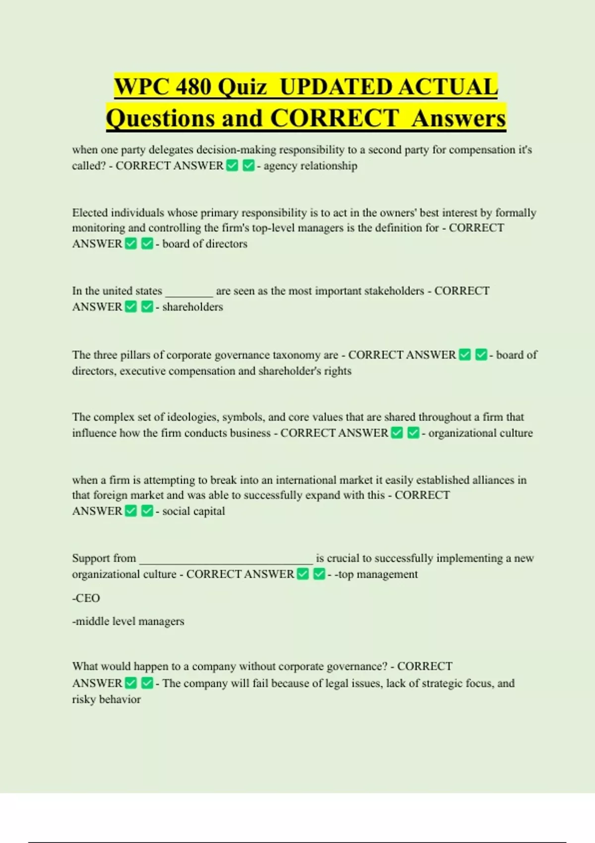 WPC 480 Quiz UPDATED ACTUAL Questions and CORRECT Answers when one party delegates decision-making responsibility to a second party for compensation it's called? - CORRECT ANSWER - agency relationship Elected individuals whose primary responsibility is to act in the owners' best interest by formally monitoring and controlling the firm's top-level managers is the definition for - CORRECT ANSWER - board of directors