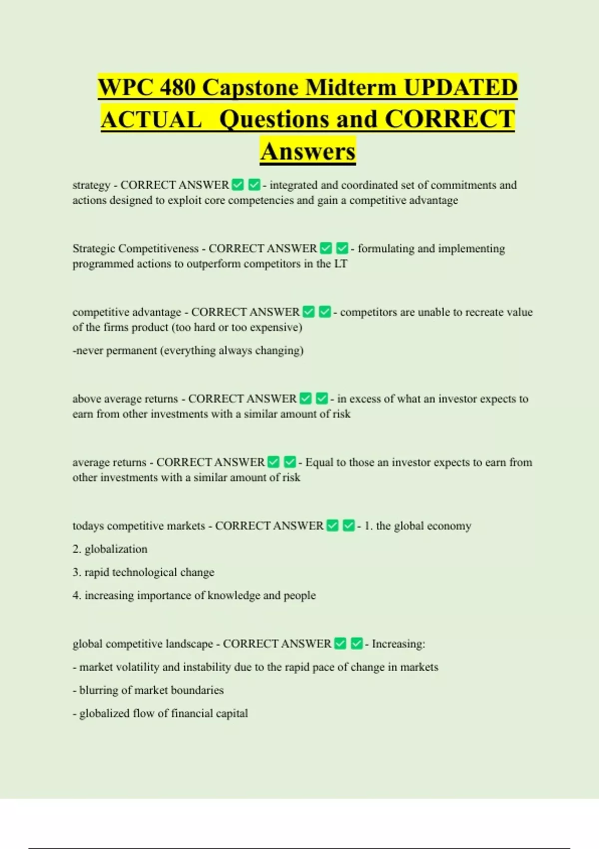 WPC 480 Capstone Midterm UPDATED ACTUAL Questions and CORRECT Answers strategy - CORRECT ANSWER - integrated and coordinated set of commitments and actions designed to exploit core competencies and gain a competitive advantage Strategic Competitiveness - CORRECT ANSWER - formulating and implementing programmed actions to outperform competitors in the L