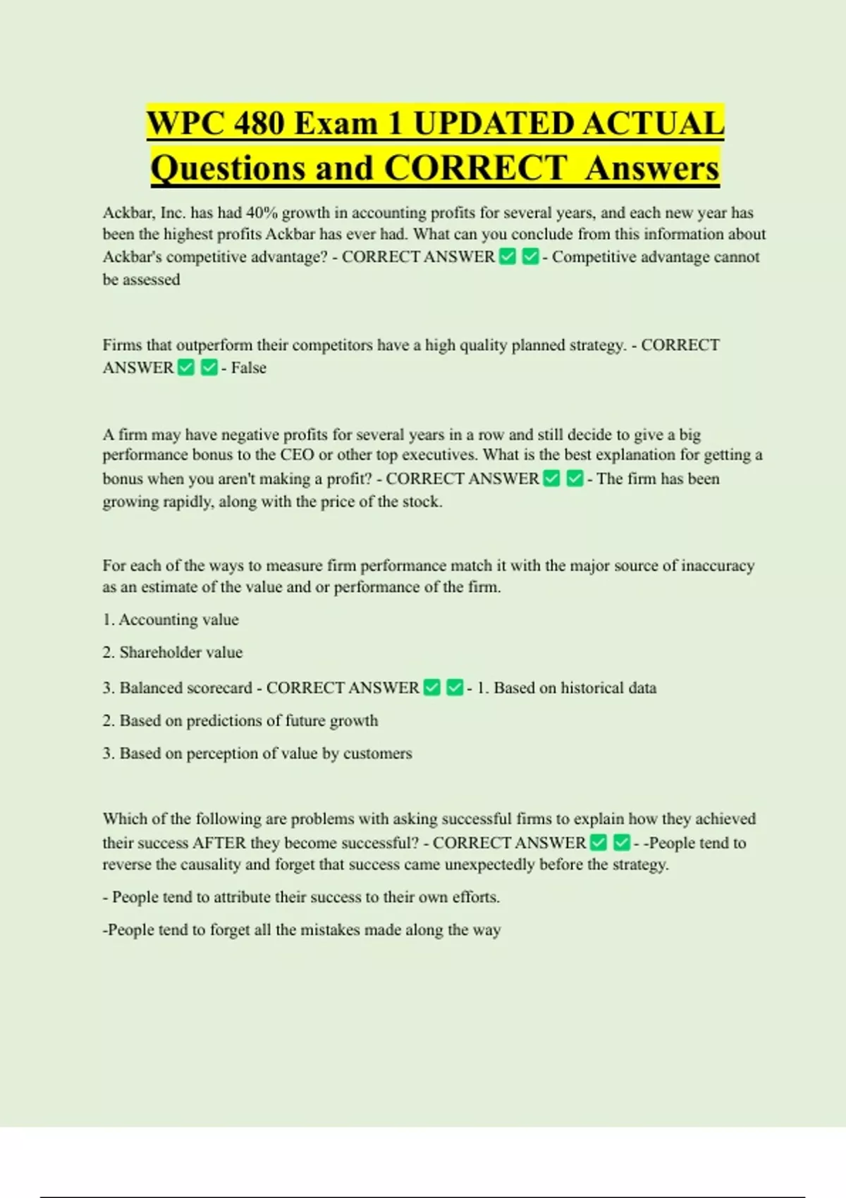 WPC 480 Exam 1 UPDATED ACTUAL Questions and CORRECT Answers Ackbar, Inc. has had 40% growth in accounting profits for several years, and each new year has been the highest profits Ackbar has ever had. What can you conclude from this information about Ackbar's competitive advantage? - CORRECT ANSWER - Competitive advantage cannot be assessed