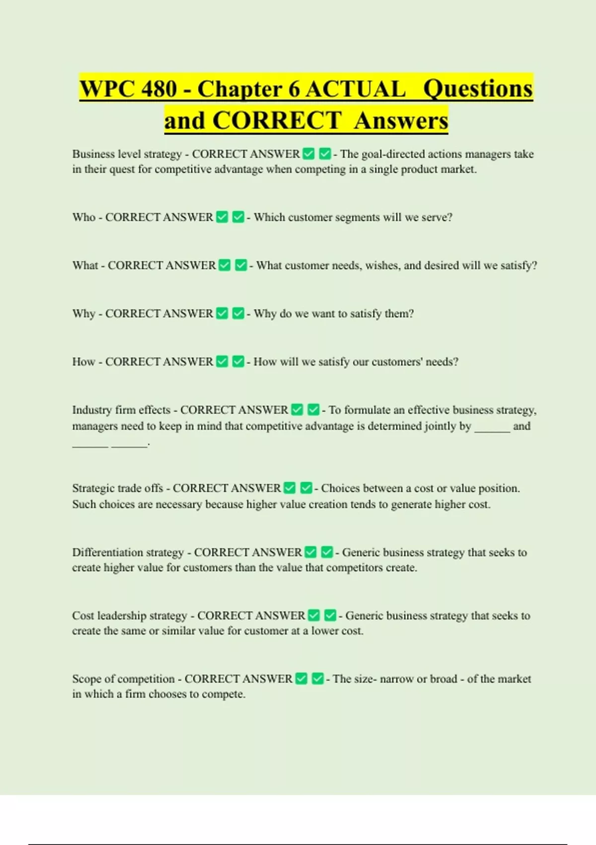 WPC 480 - Chapter 6 ACTUAL Questions and CORRECT Answers Business level strategy - CORRECT ANSWER - The goal-directed actions managers take in their quest for competitive advantage when competing in a single product market. Who - CORRECT ANSWER - Which customer segments will we serve