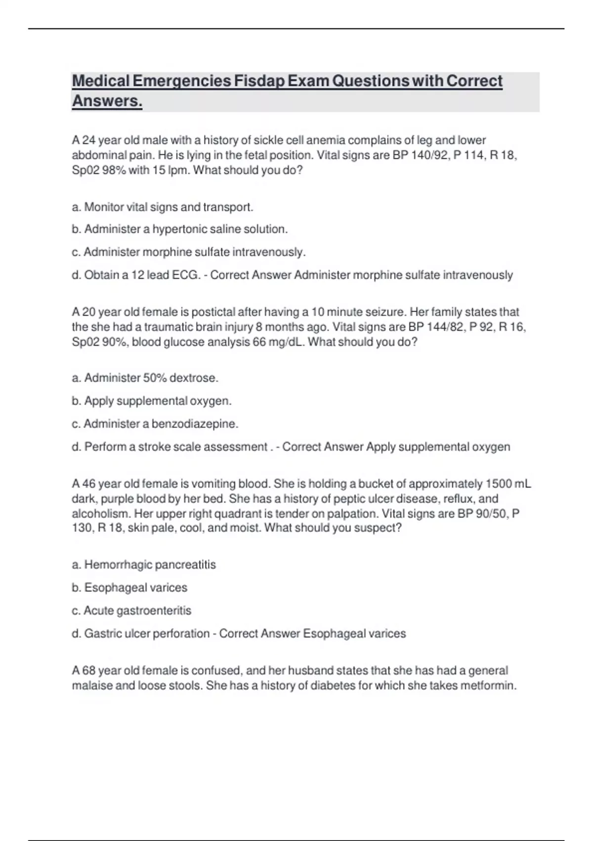 MedicalEmergenciesFisdapExamQuestionswithCorrect Answers. A 24 year old male with a history of sickle cell anemia complains of leg and lower abdominal pain. He is lying in the fetal position. Vital signs are BP 140/92, P 114, R 18, Sp02 98% with 15 lpm. What should you do? a. Monitor vital signs and transport. b. Administer a hypertonic saline solution. c. Administer morphine sulfate intravenously. d. Obtain a 12 lead ECG. - Correct Answer Administer morphine sulfate intravenously A 20 year old female is postictal after having a 10 minute seizure. Her family states that the she had a traumatic brain injury 8 months ago. Vital signs are BP 144/82, P 92, R 16, Sp02 90%, blood glucose analysis 66 mg/dL. What should you do? a. Administer 50% dextrose. b. Apply supplemental oxygen. c. Administer a benzodiazepine. d. Perform a stroke scale assessment