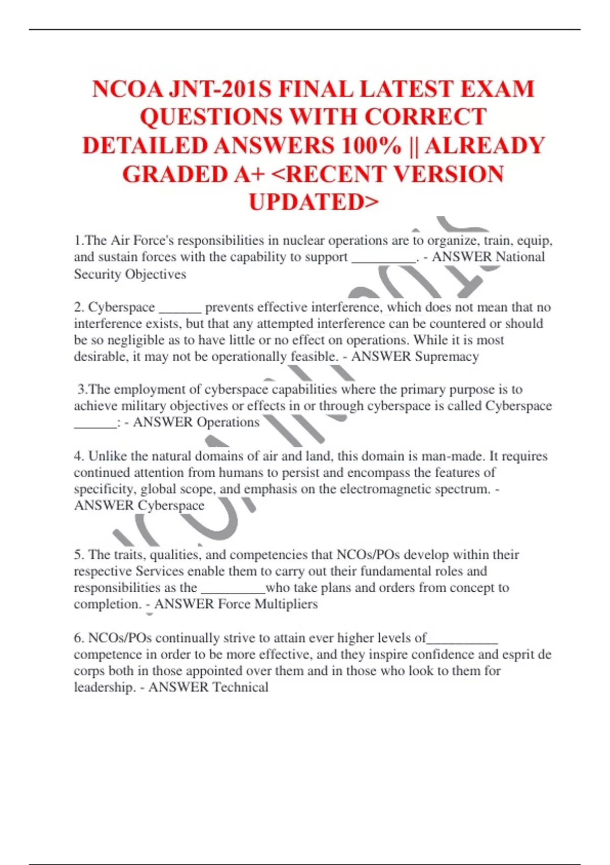 NCOA JNT-201S FINAL LATEST EXAM QUESTIONS WITH CORRECT DETAILED ANSWERS 100% || ALREADY GRADED A+ &lt;RECENT VERSION UPDATED&gt; 1.The Air Force's responsibilities in nuclear operations are to organize, train, equip, and sustain forces with the capability to support _________. - ANSWER National Security Objectives 2. Cyberspace ______ prevents effective interference, which does not mean that no interference exists, but that any attempted interference can be countered or should be so negligible as to have little or no effect on operations. While it is most desirable, it may not be operationally feasible. - ANSWER Supremacy 3.The employment of cyberspace capabilities where the primary purpose is to achieve military objectives or effects in or through cyberspace is called Cyberspace ______: - ANSWER Operations 4. Unlike the natural domains of air and land, this domain is man-made. It requires continued attention from humans to persist and encompass the features of specificity, global scope, and emphasis on the electromagnetic spectrum. - ANSWER Cyberspace 5. The traits, qualities, and competencies that NCOs/POs develop within their respective Services enable them to carry out their fundamental roles and responsibilities as the _________who take plans and orders from concept to completion. - ANSWER Force Multipliers 6. NCOs/POs continually strive to attain ever higher levels of__________ competence in order to be more effective, and they inspire confidence and esprit de corps both in those appointed over them and in those who look to them for leadership. - ANSWER Technical 7.Honor, Respect, and Devotion to Duty are the core values of which of the following Services? - ANSWER Coast Guard 8. Agility, Innovation, and Boldness are the core values of which of the following Services? - ANSWER Space Force