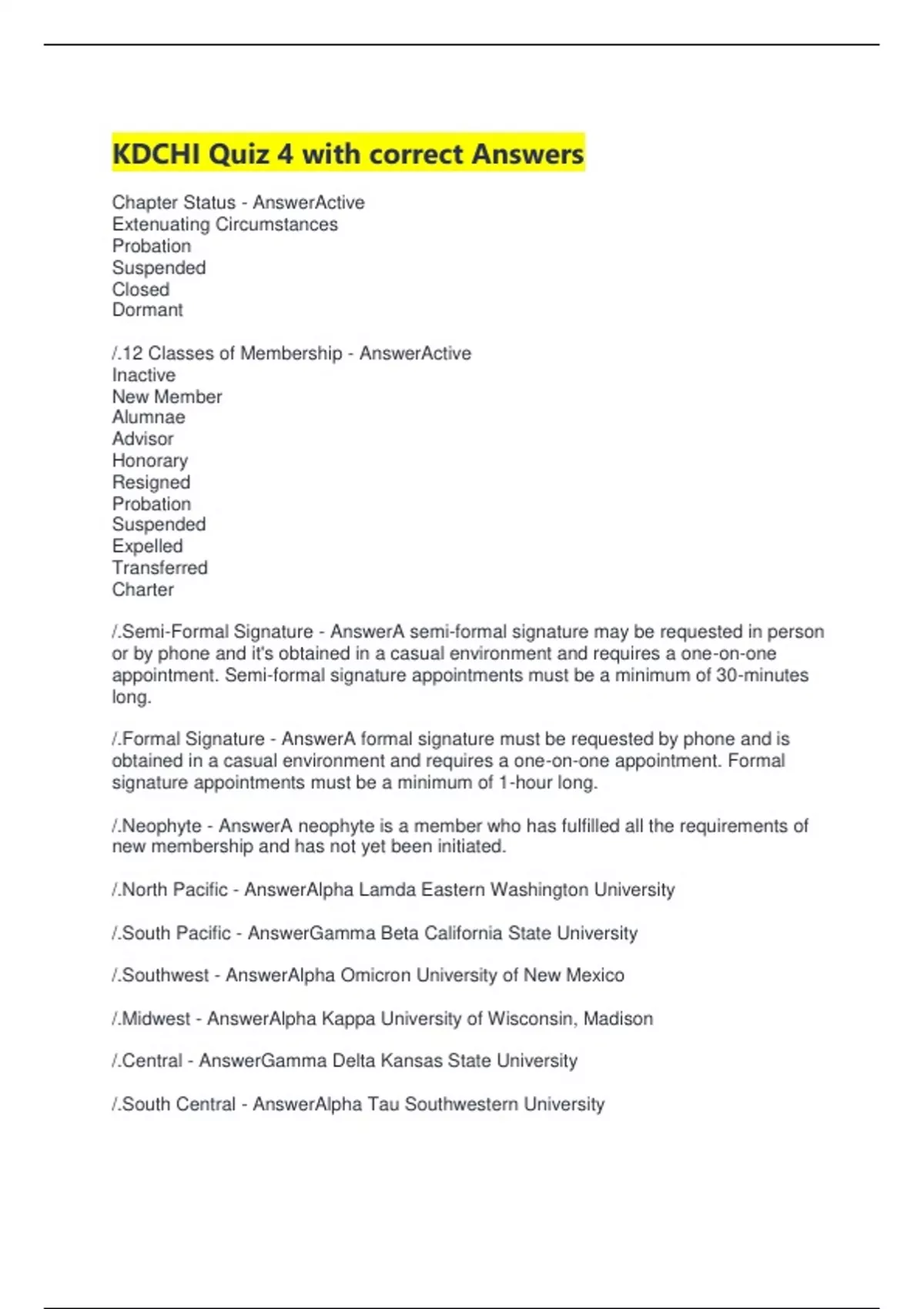 KDCHI Quiz 4 with correct Answers Chapter Status - AnswerActive Extenuating Circumstances Probation Suspended Closed Dormant /.12 Classes of Membership - AnswerActive Inactive New Member Alumnae Advisor Honorary Resigned Probation Suspended Expelled Transferred Charter /.Semi-Formal Signature - AnswerA semi-formal signature may be requested in person or by phone and it's obtained in a casual environment and requires a one-on-one appointment. Semi-formal signature appointments must be a minimum of 30-minutes long. /.Formal Signature - AnswerA formal signature must be requested by phone and is obtained in a casual environment and requires a one-on-one appointment. Formal signature appointments must be a minimum of 1-hour long. /.Neophyte - AnswerA neophyte is a member who has fulfilled all the requirements of new membership and has not yet been initiated. /.North Pacific - AnswerAlpha Lamda Eastern Washington University /.South Pacific - AnswerGamma Beta California State University /.Southwest - AnswerAlpha Omicron University of New Mexico /.Midwest - AnswerAlpha Kappa University of Wisconsin, Madison /.Central - AnswerGamma Delta Kansas State University /.South Central - AnswerAlpha Tau Southwestern University