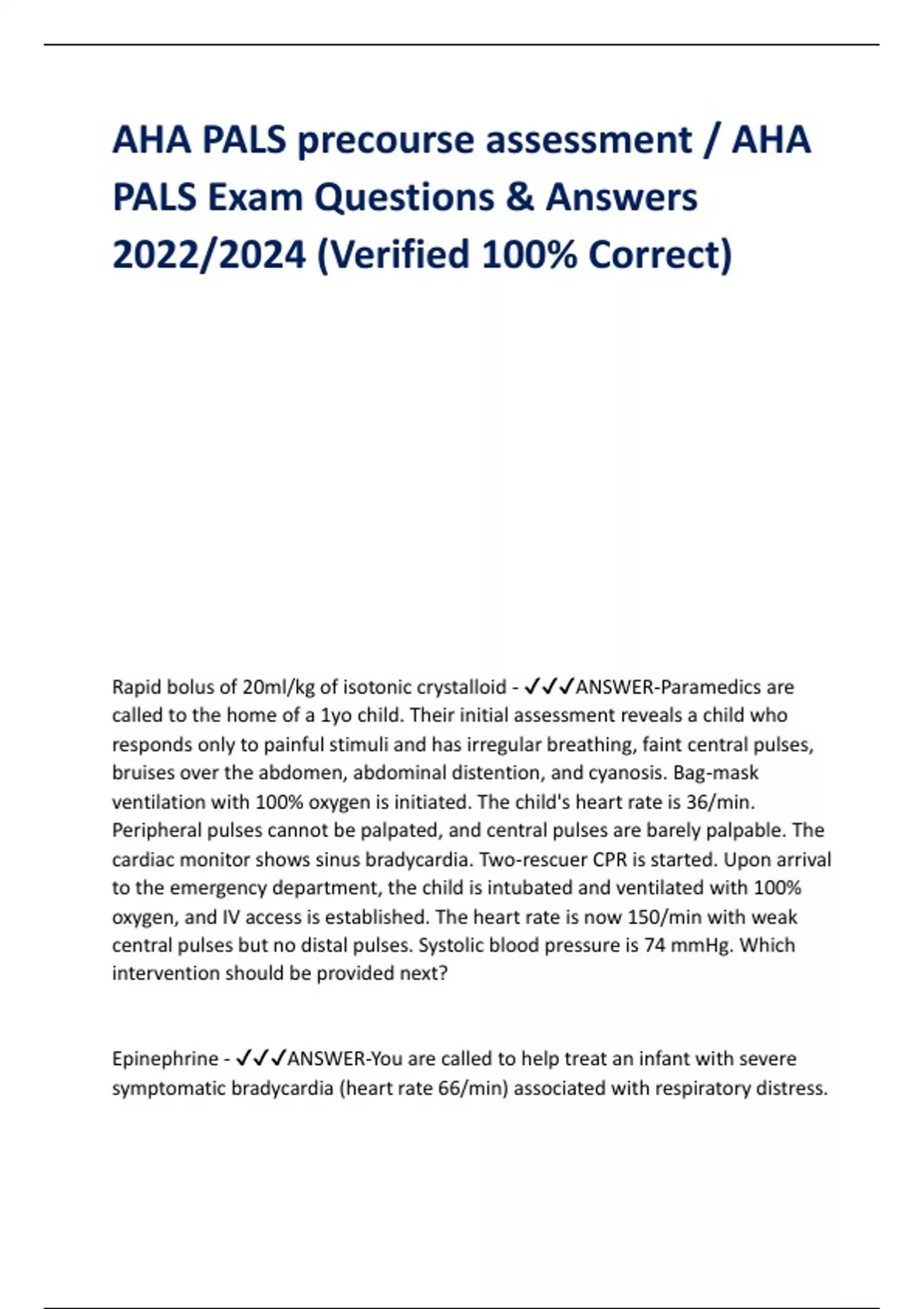 AHA PALS precourse assessment / AHA PALS Exam Questions & Answers 2022/2024 (Verified 100% Correct) Rapid bolus of 20ml/kg of isotonic crystalloid - ANSWER-Paramedics are called to the home of a 1yo child. Their initial assessment reveals a child who responds only to painful stimuli and has irregular breathing, faint central pulses, bruises over the abdomen, abdominal distention, and cyanosis. Bag-mask ventilation with 100% oxygen is initiated. The child's heart rate is 36/min. Peripheral pulses cannot be palpated, and central pulses are barely palpable. The cardiac monitor shows sinus bradycardia. Two-rescuer CPR is started. Upon arrival to the emergency department, the child is intubated and ventilated with 100% oxygen, and IV access is established. The heart rate is now 150/min with weak central pulses but no distal pu