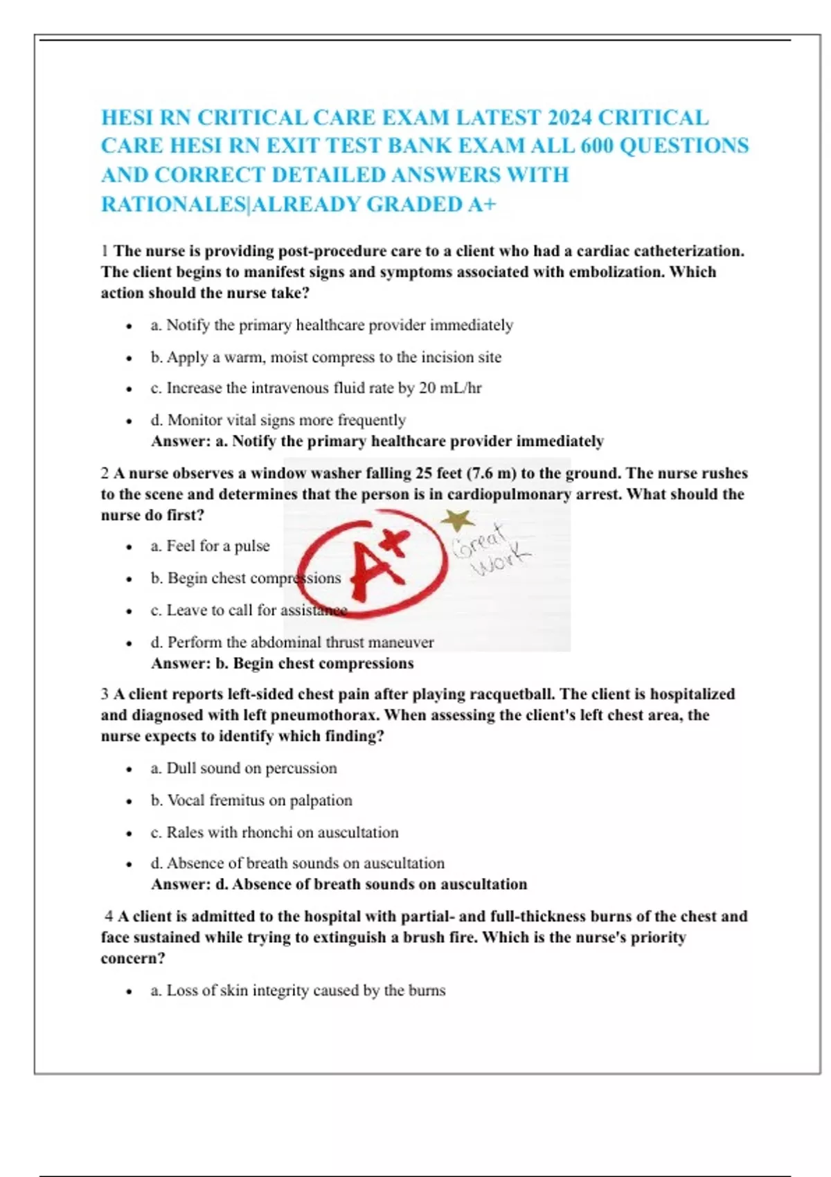 CARE HESI RN EXIT TEST BANK EXAM ALL 600 QUESTIONS