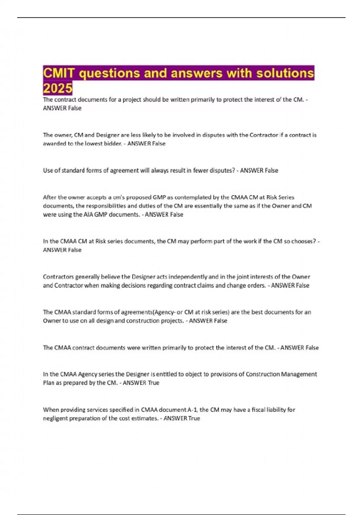 The contract documents for a project should be written primarily to protect the interest of the CM. - ANSWER False The owner, CM and Designer are less likely to be involved in disputes with the Contractor if a contract is awarded to the lowest bidder. - ANSWER False Use of standard forms of agreement will always result in fewer disputes? - ANSWER False After the owner accepts a cm's proposed GMP as contemplated by the CMAA CM at Risk Series documents, the responsibilities and duties of the CM are essentially the same as if the Owner and CM were using the AIA GMP documents. - ANSWER False In the CMAA CM at Risk series documents, the CM may perform part of the work if the CM so chooses? - ANSWER False Contractors generally believe the Designer acts independently and in the joint interests of the Owner and Contractor when making decisions regarding contract claims and change orders. - ANSWER False The CMAA standard forms of agreements(Agency- or CM at risk series) are the best documents for an Owner to use on all design and construction projects. - ANSWER False The CMAA contract documents were written primarily to protect the interest of the CM. - ANSWER False In the CMAA Agency series the Designer is entitled to object to provisions of Construction Management Plan as prepared by the CM. - ANSWER True When providing services specified in CMAA document A-1, the CM may have a fiscal liability for negligent preparation of the cost estimates. - ANSWER True In the CMAA CM at Risk Series documents, the CM is the Owner's principle agent until a GMP is accepted by the Owner. - ANSWER True If an Owner uses the CMAA documents A-4, the Owner may be obligated to compensate the Designer as an additional service for site visits requ