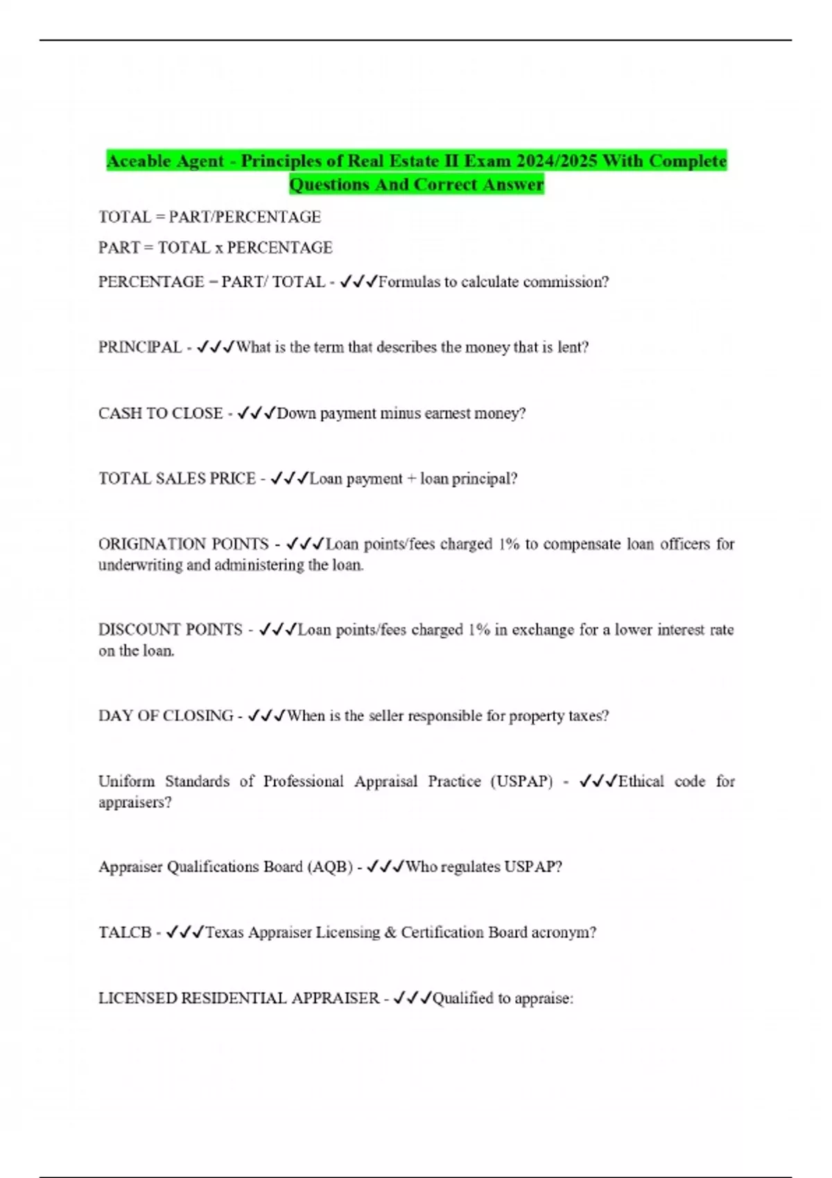 Aceable Agent - Principles of Real Estate II Exam 2024/2025 With Complete Questions And Correct Answer