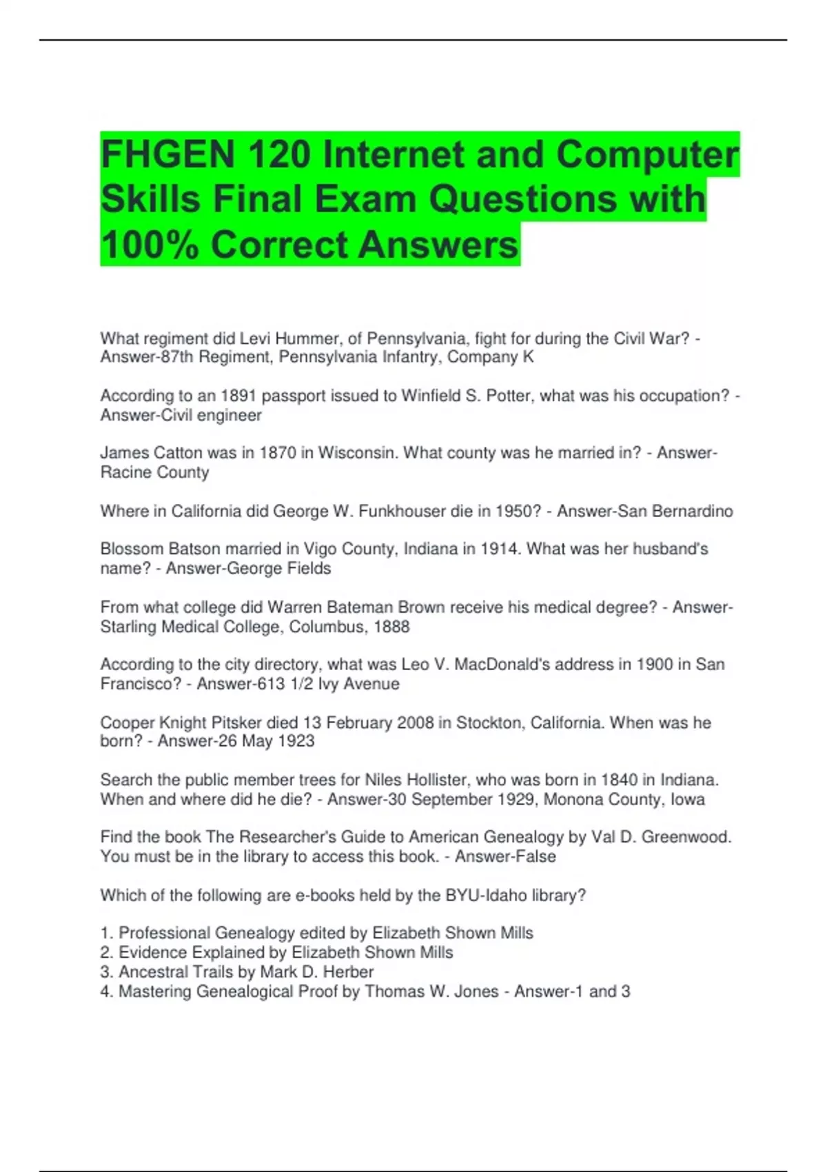 FHGEN 120 Internet and Computer Skills Final Exam Questions with 100% Correct Answers What regiment did Levi Hummer, of Pennsylvania, fight for during the Civil War? - Answer-87th Regiment, Pennsylvania Infantry, Company K According to an 1891 passport issued to Winfield S. Potter, what was his occupation? - Answer-Civil engineer James Catton was in 1870 in Wisconsin. What county was he married in? - Answer-Racine County Where in California did George W. Funkhouser die in 1950? - Answer-San Bernardino Blossom Batson married in Vigo County, Indiana in 1914. What was her husband's name? - Answer-George Fields From what college did Warren Bateman Brown receive his medical degree? - Answer-Starling Medical College, Columbus, 1888 According to the city directory, what was Leo V. MacDonald's address in 1900 in San Francisco? - Answer-613 1/2 Ivy Avenue Cooper Knight Pitsker died 13 February 2008 in Stockton, California. When was he born? - Answer-26 May 1923 Search the public member trees for Niles Hollister, who was born in 1840 in Indiana. When and where did he die? - Answer-30 September 1929, Monona County, Iowa Find the book The Researcher's Guide to American Genealogy by Val D. Greenwood. You must be in the library to access this book. - Answer-False Which of the following are e-books held by the BYU-Idaho library? 1. Professional Genealogy edited by Elizabeth Shown Mills 2. Evidence Explained by Elizabeth Shown Mills 3. Ancestral Trails by Mark D. Herber 4. Mastering Genealogical Proof by Thomas W. Jones - Answer-1 and 3 T/F: The Kansas Historical Society website includes a link to both the Kansas State Archives catalog and the Kansas Museum of History catalog. - Answer-True Which of the following is a digitized collection held by the Kansas Historical Society? 1. Cherokee County organization records created by Kansas. Secretary of State, Date: 2. Abraham Lincoln Bicentennial Commission records created by Abraham Lincoln Bicentennial Commission, Date: 3. Falun Evangelical Lutheran Church records created by Falun Lutheran Church (Falun, Kan.), Date: 4. Margrave family papers created by Margrave family, Date: - Answer-1. Cherokee County organization records created by Kansas. Secretary of State, Date: T/F: You can search the Library of Congress Catalog by browsing, completing an advanced search, and completing a keyword search. - Answer-True Locate the collection Lorenzo J. Greene papers, (bulk ). How many items are part of this collection? - Answer-46,200 items T/F: There is a National Archives Catalog Guide for Genealogists and Family Historians. - Answer-True Locate the Official Military Personnel Records, collection. What is the National Archives Identifier number for this collection? - Answer- Locate the Court Minutes, collection from RG: 21, National Archives Identifier: 2658242. How can you access this collection? - Answer-This collection can be accessed at the National Archives at Forth Worth Locate the 3-page "Naturalization Record for John Tapko" item from RG: 21, Petitions for Naturalization, National Archives Identifier: 7788671. What day did he list as his birthday? - Answer-21 September 1879 T/F: If you find a database that should contain a record of your ancestor, but it does not, then you should evaluate the database before coming to the conclusion that the record does not exist. - Answer-True What is often included in a database title that helps you evaluate the coverage of the collection? - Answer-Location(s) and year(s) Which of the following databases includes more entries for marriages in 1837 in Leon, Florida? - Answer-Florida Marriages, If you were searching FamilyS for an ancestor who was born in New York City, in which collection would you be more likely to find a match: - Answer-New York, New York City Births, - more specific to the city = more relevant sources than if you did it just by state Alfred Oakley was born in Chicago, Illinois. Locate his birth record using a specific database at FamilyS. Alfred was born on what date? - Answer-30 September 1889 What was the nationality of Alfred Oakley's father? - Answer-Swede Locate a US passport from 1921 for Robert Capelle. (Note: His passport is two pages.) Where was Robert born? - Answer-Lauenstein, Germany Locate a US passport from 1921 for Robert Capelle. (Note: His passport is two pages.) Where did Robert naturalize? - Answer-Chicago, Illinois Bertha Sumi immigrated to the United States. She arrived with her family in New York in 1881. What was the name of the ship she traveled on? - Answer-Amerique In 1911, Lucy Grace Walker lived with her family in Halifax, England. She was born about 1905. What was her father's occupation? Hint: Her name is not indexed in the database correctly. - Answer-Machine painter
